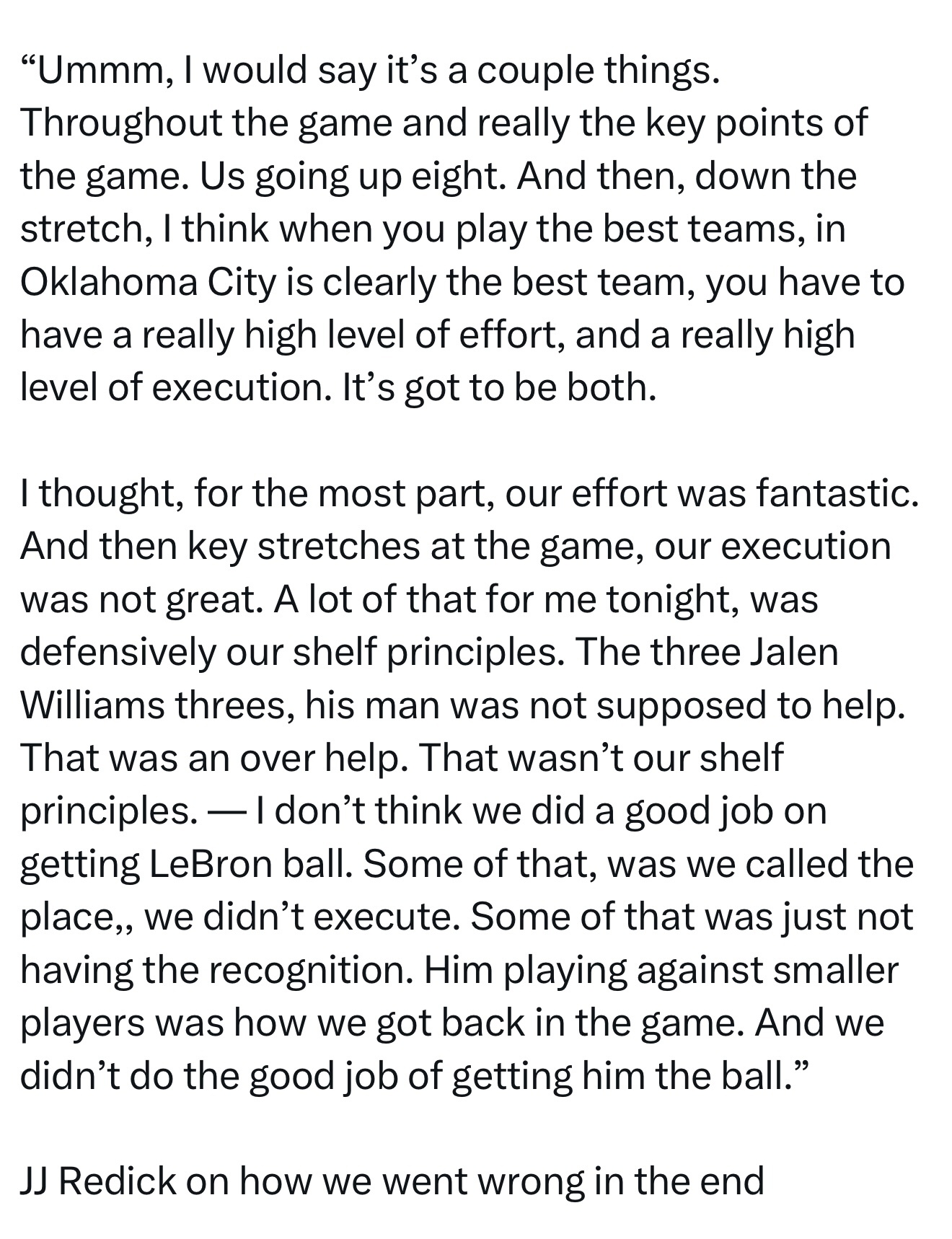 “嗯……我认为问题出在几个方面。贯穿整场比赛,尤其是在关键时刻——当我们领先8分时,以及最后收官阶段。面对联盟顶级球队,比如俄克拉荷马城(雷霆)显然是这样的球队,你必须同时保持极高的努力程度和战术执行水平。