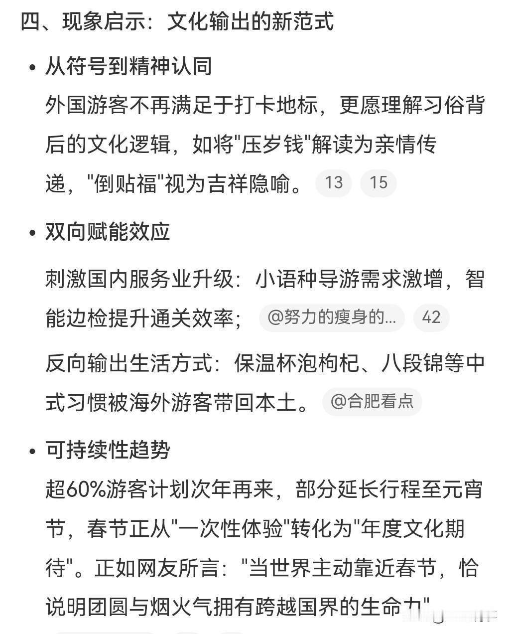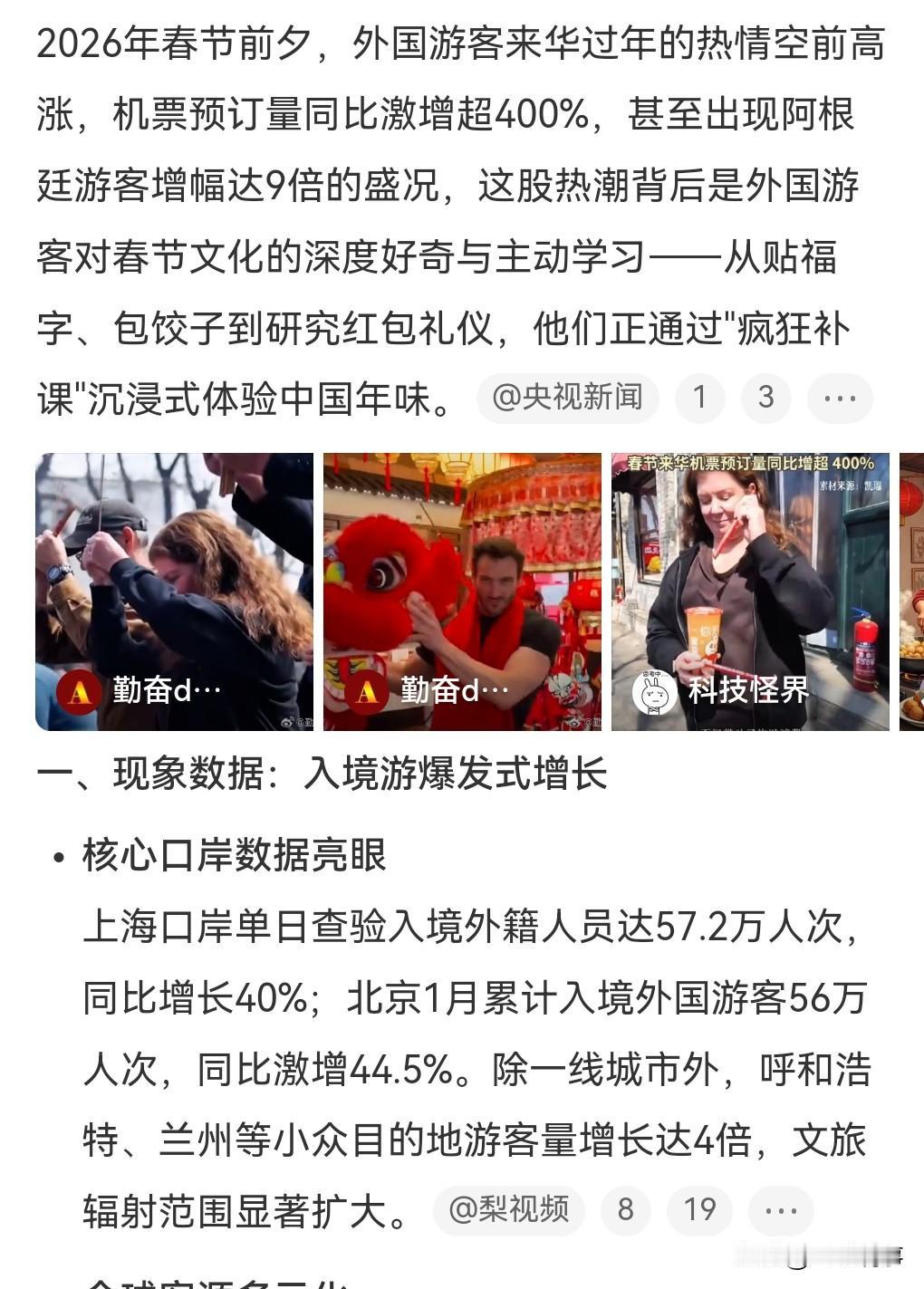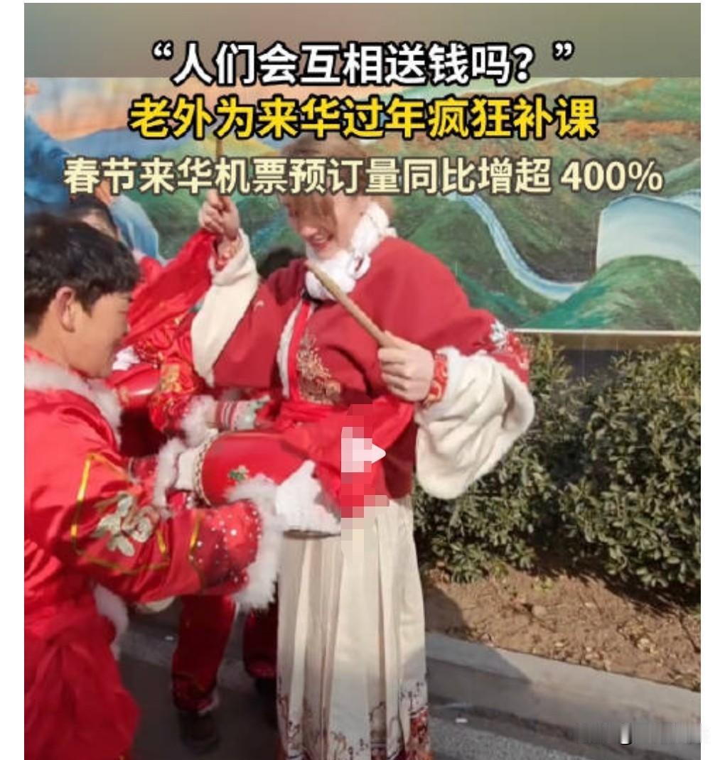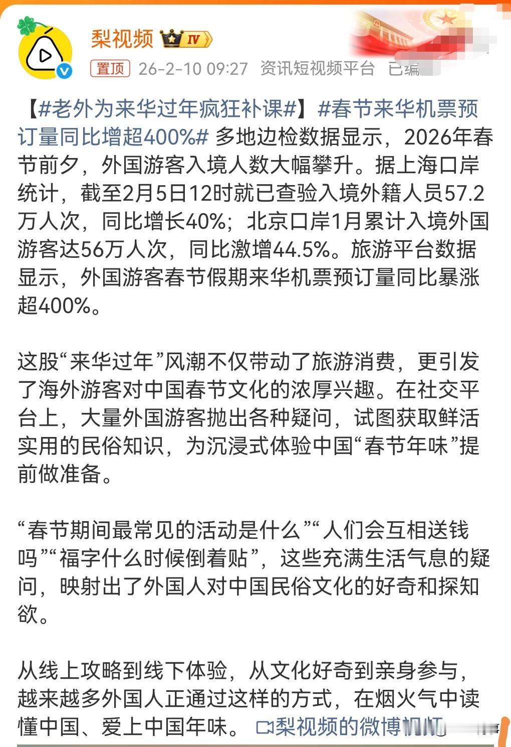 这真的是太厉害了,中国的影响力真的是越来越大了,之前网上有个话题叫做成为中国人。 有些外国人对中国真的很向往,很多都来中国来体验春节。 2月10日热点,春节来华机票预订量同比增超400%。 中国的春节确实非常的有意思,里面的文化当真是博大精深,比老外的那些节日有趣多了。 以前我国总是有些人喜欢过圣诞节,其实老外该学习我们的春节。