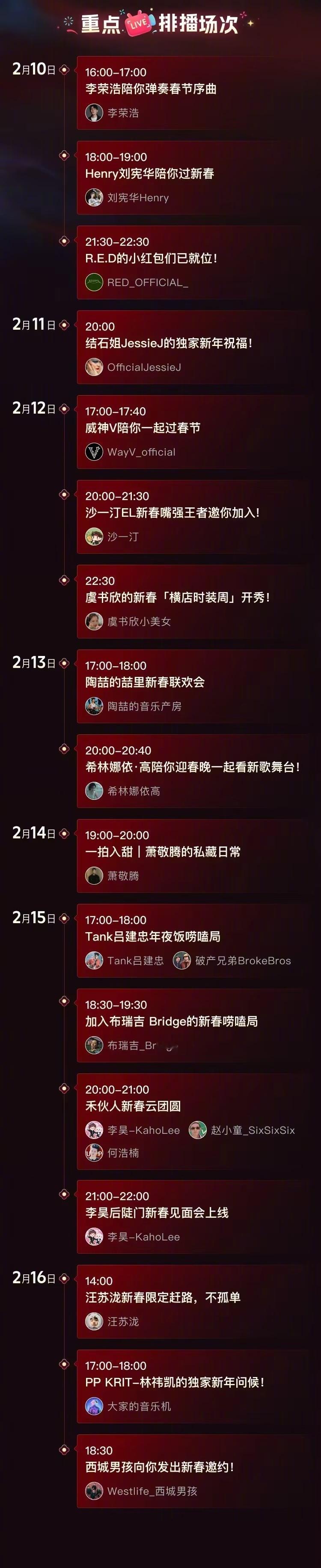B站春节同好唠嗑局 这是什么新年唠嗑局,这不是我的新年追星日程吗?既然是全明星亮嗓子大会,那每个明星来直播间高低得唱几句再走吧?!春节期间给你唱歌,陪你聊天,妥妥的新年大福利了,已知阵容就有刘宪华、Tank、结石姐,还有虞书欣、汪苏泷、陶喆!小破站你好事做尽!内娱的半壁江山来b站过春节