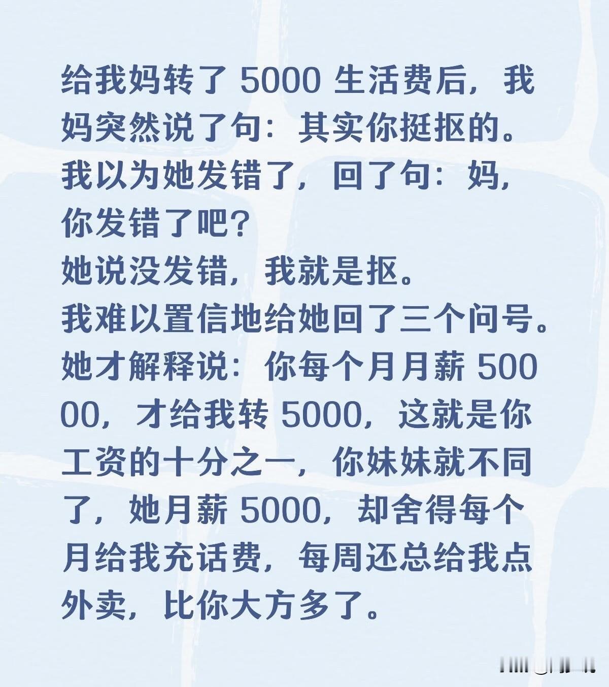 “扎心!”看到一个故事,月薪五万的大女儿,给母亲转去5000元生活费,本是一片孝心,没想到母亲直接吐槽挺抠门的。母亲觉得,大女儿只拿出收入的十分之一,远不如月薪五千的小女儿贴心。小女儿会常打电话、点外卖、买小物件,在她眼里,这才是大方。这让大女儿委屈不已,家里大件家电全是她置办,多年转账几十万,却比不上几十块的外卖。更让人心寒的是,母亲还发朋友圈暗讽大女儿抠门,让大女儿彻底无语。 这事在网上传开后,众多网友纷纷直言:“孝顺不能用比例衡量,用心和用钱,不该被粗暴比较。” 在周少看来,亲情里最忌讳的就是这样片面的评判。换做是我,我内心也可能也要被气疯。很多长辈习惯用细碎的陪伴定义孝心,却忽略了子女默默承担的经济压力。 实际上,真正的孝顺从没有统一标准,别让冰冷的对比,伤了真心付出的孩子,也别让最亲的人,在计较里慢慢疏远。#寻美三湘#