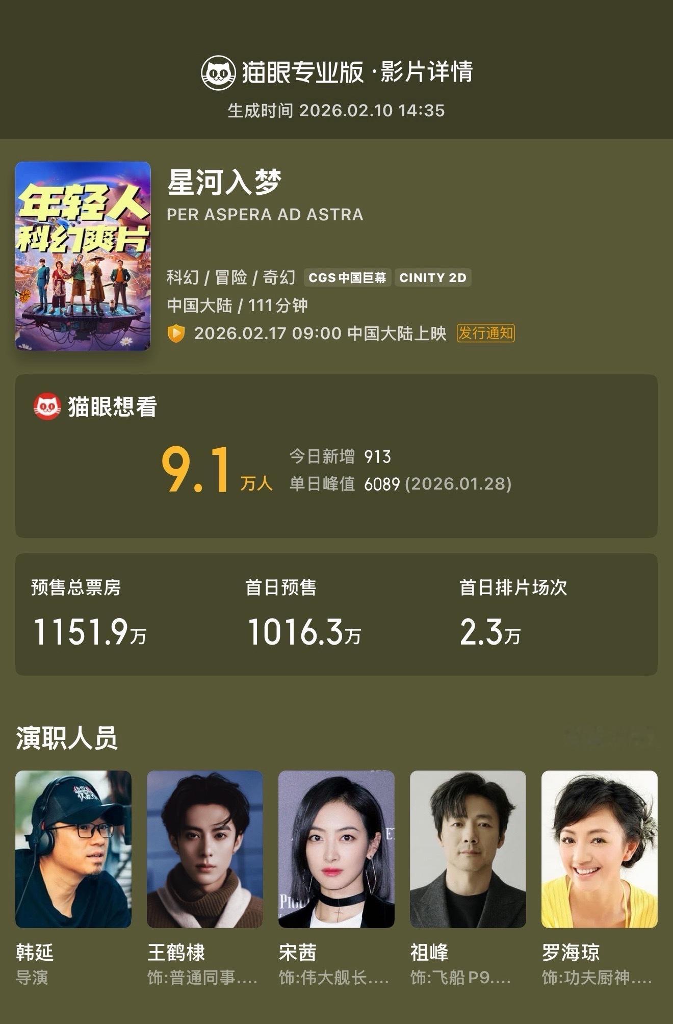孟子义连包20场支持王鹤棣新片孟子义连包20场支持星河入梦 据猫眼专业版云包场显示,连包20场支持电影《星河入梦》!该片由傅若清担任总监制,韩延执导,王鹤棣、宋茜领衔主演,祖峰、罗海琼主演,汪铎特别出演。据猫眼专业版数据,电影《星河入梦》累计预售票房已超1151万,将于大年初一全国上映,现已开启预售!