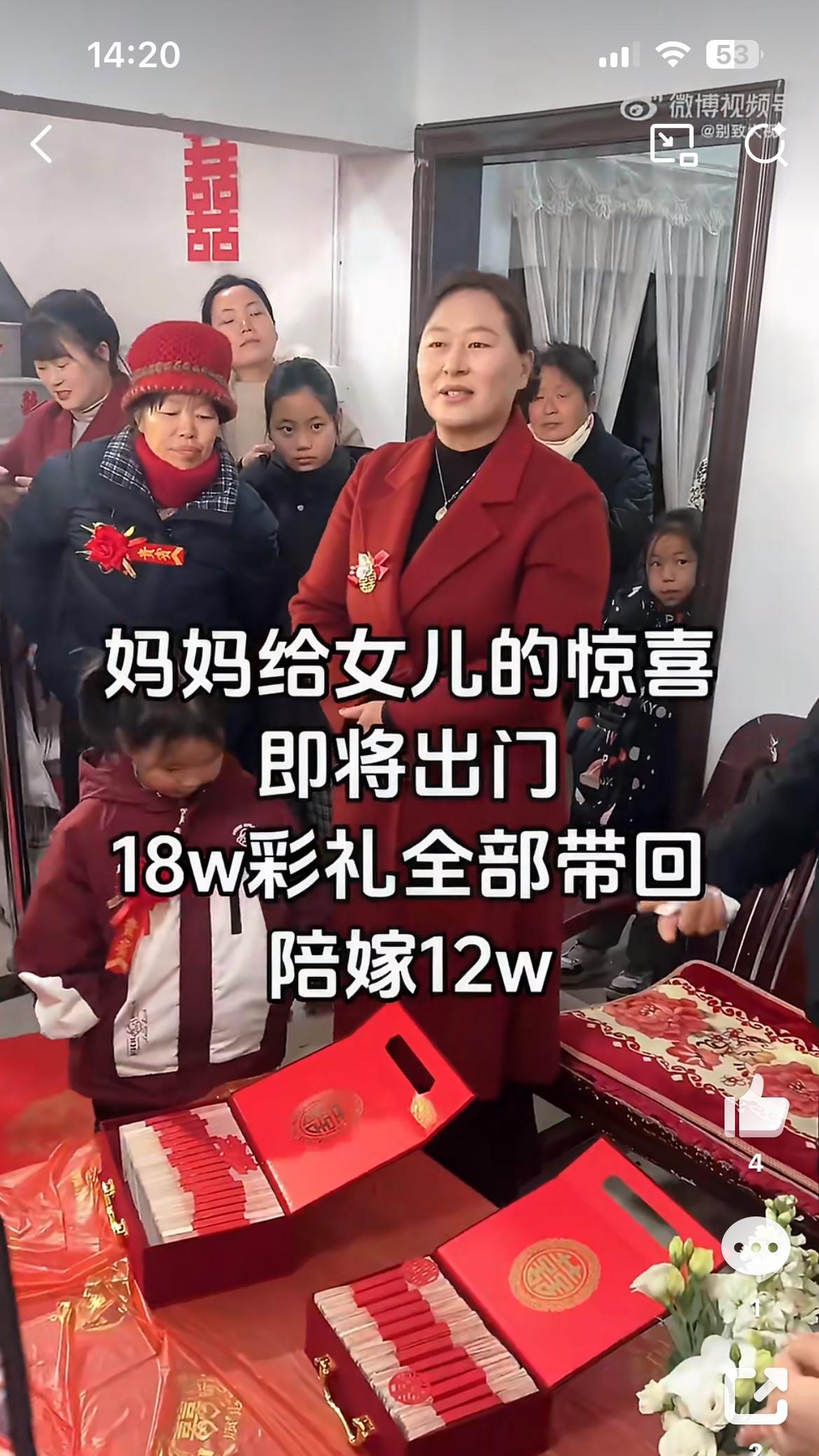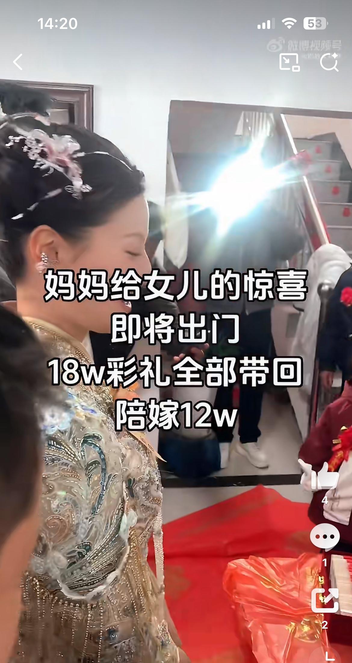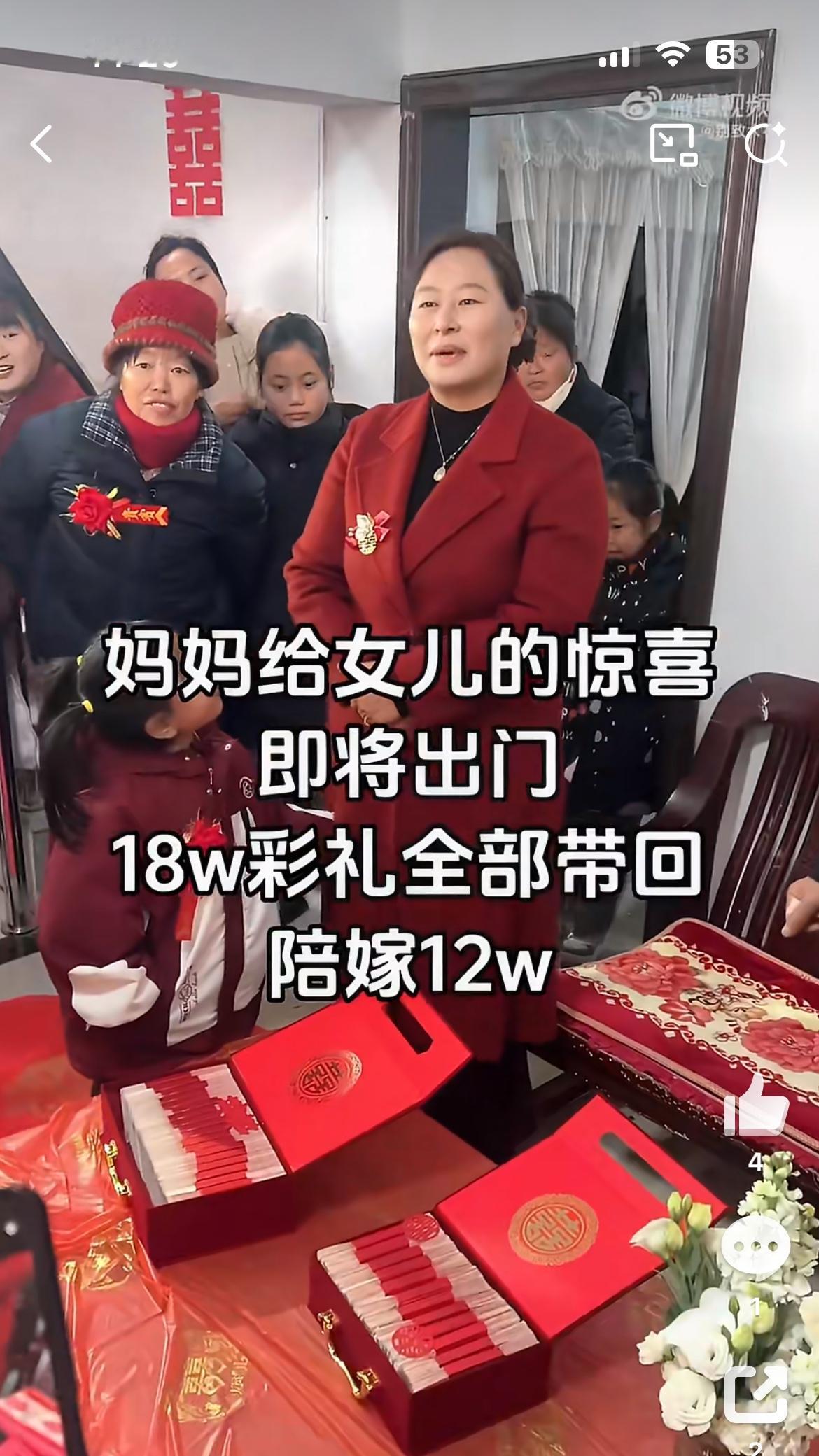 女儿出嫁男方给彩礼18万,妈妈霸气陪嫁12万凑齐30万送给女儿,让女婿感动坏了。如果彩礼都是像这样的丈母娘支配,天下哪有难结的婚。只可惜,现在各地彩礼越来越高,越是穷的地方,彩礼要价越高,已经成为男方家庭无法承受的重担。女方家得了彩礼,基本一份不拿出来,变相成为卖女儿的钱。男方和女方,哪有感情,都是交易,这样的婚姻十有八九等着散伙。女儿出嫁彩礼 家庭彩礼