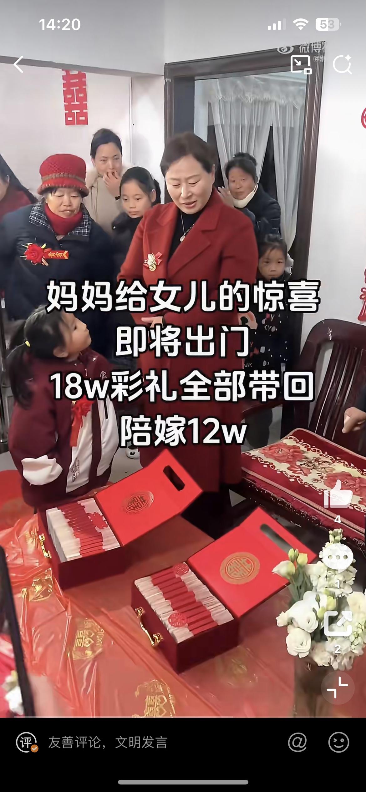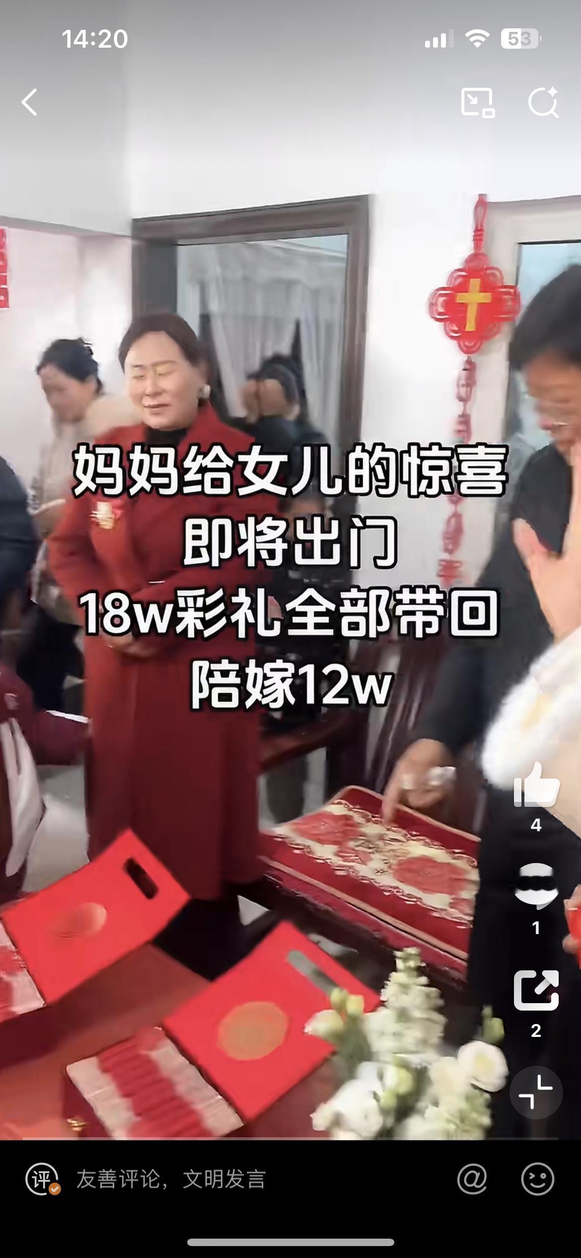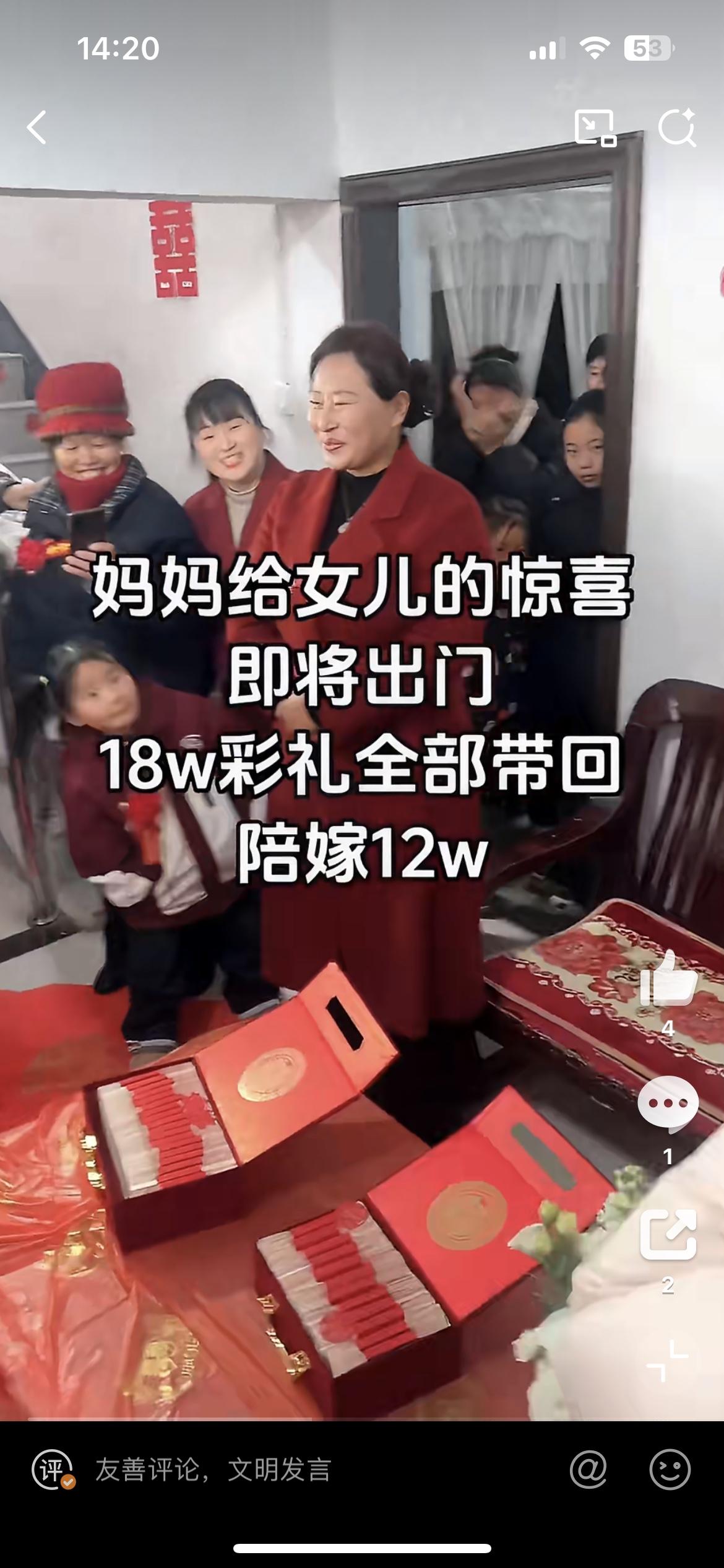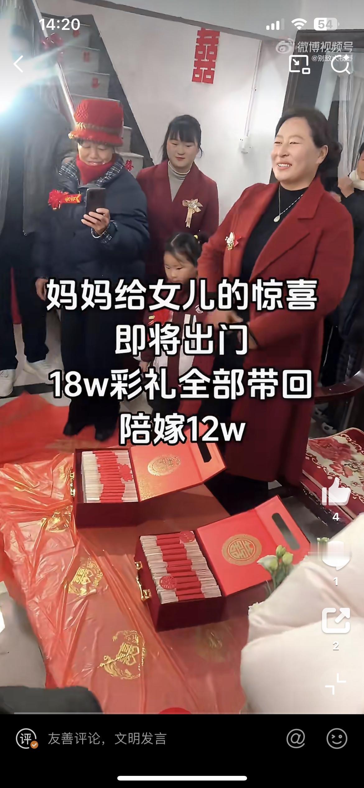 女儿出嫁男方给彩礼18万,妈妈霸气陪嫁12万凑齐30万送给女儿,让女婿感动坏了。如果彩礼都是像这样的丈母娘支配,天下哪有难结的婚。只可惜,现在各地彩礼越来越高,越是穷的地方,彩礼要价越高,已经成为男方家庭无法承受的重担。女方家得了彩礼,基本一份不拿出来,变相成为卖女儿的钱。男方和女方,哪有感情,都是交易,这样的婚姻十有八九等着散伙。女儿出嫁彩礼 家庭彩礼