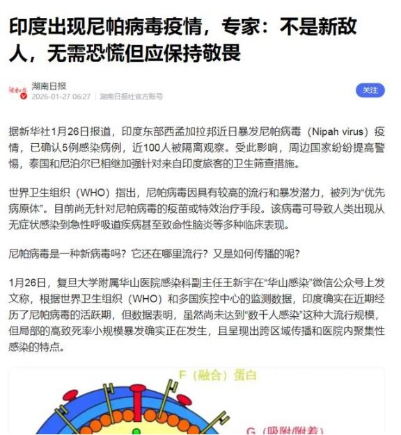 大胆的预言,2026年的黑天鹅事件,印度极有可能成为一颗“毁灭”世界的定时炸弹。 尼帕病毒早在上世纪末就在亚洲南部冒过头。马来西亚那边第一次发现它的时候,还闹得挺大。病毒主要从果蝠身上传给人,有时候猪也掺和进来。人传人虽然不算太常见,但一旦在医院里发生,就容易出事儿。致死率高得吓人,能到40%到75%,而且没疫苗没特效药,只能靠支持治疗硬扛。 今年1月底,印度卫生部门报告了西孟加拉邦的两例确诊病例。俩人都是25岁的护士,在北24帕尔加纳斯区巴拉萨特的同一家私立医院工作。他们在去年12月底开始有症状,1月13日确诊。女护士情况严重,还上了呼吸机,男护士好些,正在恢复。初步调查显示,他们之间有接触,但源头还不清楚。印度政府追踪了196名密切接触者,全都测了阴性,到现在没新病例冒出来。 世界卫生组织评估说,这次事件在当地风险中等,国家层面低,全球更低。因为没证据显示病毒在社区传播,也没跨国迹象。可话说回来,印度医疗体系的弱点大家都知道。公共卫生投入占GDP比例不高,医院资源紧张。全国医生数量不足,很多地方一个医生要管上千人。过去有过类似问题,比如氧气供应中断导致儿童死亡的悲剧。要是尼帕真扩散开来,公立医院肯定扛不住,病人堆积,交叉感染风险大增。 印度人口多,流动频繁,这也是隐患。宗教活动常常聚集上千人,甚至跨邦跨国。之前新冠疫情时,就有大型集会引发大面积传播。尼帕如果搭上这顺风车,麻烦就大了。那个达瓦宣教团在全球上百个地方有分支,每年派人出去交流。要是病毒混进去,通过航班和边境,周边国家先遭罪。 而农村地区更让人担心。那里卫生条件差,很多人直接喝生水,吃野果,容易接触蝠类。尼帕的主要宿主就是果蝠,农村环境正好给病毒机会。检测能力弱,症状出来可能好几天才确诊,等反应过来,病毒已经传开。私立医院贵,穷人只能去公立,环境拥挤,防控跟不上。 周边国家已经警觉起来了。泰国加强了对来自西孟加拉邦旅客的筛查,机场测体温和问行程。尼泊尔也跟进,边境检查更严。甚至中国和一些东南亚国家也提高了警惕,虽然世卫没建议限制旅行贸易,但大家都不想重蹈新冠的覆辙。 毕竟,印度过去有过多次尼帕爆发,2001年西里古里的45例,致死率高;2007年纳迪亚的5例,全死了;喀拉拉邦从2018年起几乎年年有,2023年6例死了2个。这些历史告诉我们,病毒在印度有土壤。要是防控松懈,加上气候变化让蝠类活动增多,2026年真可能来场大爆发。 黑天鹅事件就是这样,出其不意却后果严重。尼帕比新冠致命率高,比埃博拉传播隐蔽。要是大规模流行,全球医疗体系都得紧张。印度作为人口大国,一旦失控,病毒外溢概率不小。