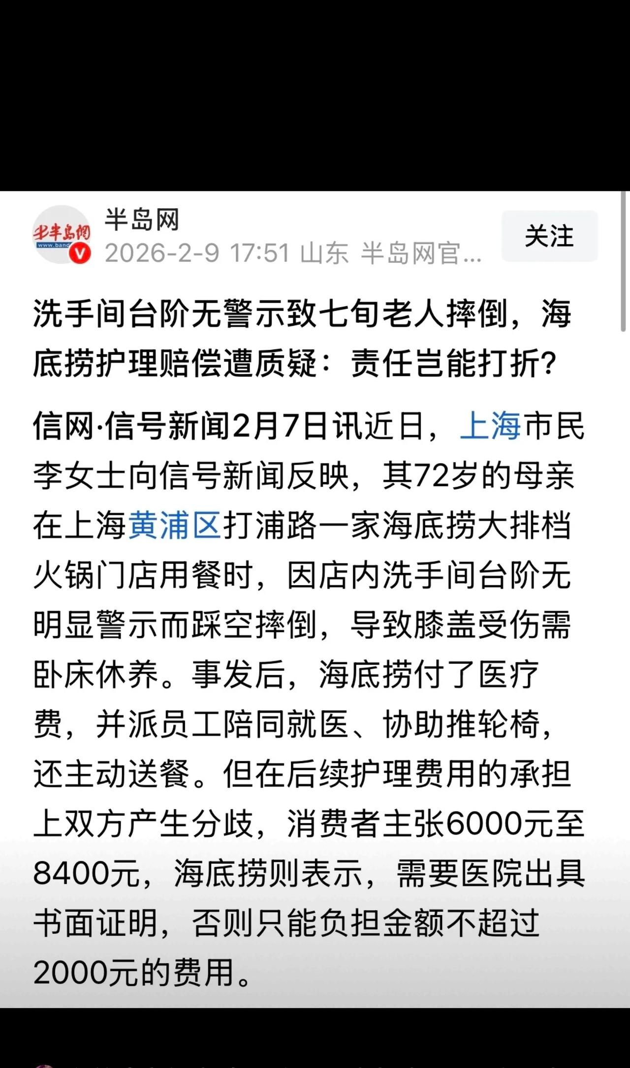 上海,女子带一家人吃海底捞,72岁的老母亲独自去上厕所后迟迟未归,女子连忙去厕所找人,发现母亲倒在地上,整个人动弹不得,她一问才知道,因为台阶跟地面铺的是一模一样的瓷砖,又没有警示牌,母亲分辨不清,一脚踩空了。事后母亲得卧床数周,女子准备找护工照看,费用在6000-8000块,然而火锅店只愿赔2000,如果女子不愿意,那就必须得开个证明。 上海一顿团圆火锅,吃出了全家的糟心事,看完真的替老人委屈! 1月21号晚上,李女士带着72岁老母亲和一大家子人去海底捞聚餐,本来热热闹闹吃火锅,结果母亲去趟厕所,直接摔得站不起来! 老人迟迟没回来,李女士冲去厕所一看,心都碎了: 老母亲瘫在地上,膝盖肿成发面馒头,嘴唇磕破,浑身动弹不得,疼得话都说不完整。 好好的人怎么会摔成这样? 原来厕所门口有个台阶,台阶和地面瓷砖一模一样!颜色、花纹完全没区别,远看就是一整块平地,连个“小心台阶”的警示牌都没有! 老人眼神本就花,一脚踩空,直接重重摔跪在地! 送医检查后,老人软组织严重挫伤,必须卧床静养1个多月,连翻身都费劲。 李女士夫妻要上班带娃,离家30多公里根本顾不上,只能请护工,一算费用最少6000,多则8000块。 结果店家的处理方式,直接让网友炸了: ✅ 方案1:店里直接赔,最多只给2000块 ✅ 方案2:走保险,必须让72岁老人再跑医院,开“必须卧床+专人看护”的证明! 李女士直接气哭:2000块连半个月护工费都不够!让老人再折腾排队检查,万一再摔一次谁负责? 这事冲上热搜后,网友直接吵翻了: “这隐形台阶也太坑了!别说老人,年轻人都容易踩空!” “2000块打发谁呢?安全设施不到位,全责没跑!” “店家故意为难人吧?开证明就是变相拒赔!” 从法律上来说,《民法典》1198条写得明明白白: 经营场所必须尽到安全保障义务! 海底捞卫生间台阶无警示、无区分、无防护,属于重大安全隐患,是导致老人摔倒的主要原因,医疗费、护理费本就该店家全额承担! 拿“开证明”当门槛,纯属给消费者维权设卡! 我真的想说: 做生意别丢了良心,一块警示牌才几块钱? 省了这点小钱,摔伤一位老人,赔了钱还砸了招牌,到底图啥? 老人安安稳稳的,比什么都重要,店家这点责任都担不起,实在说不过去! 好在最后双方协商好了,老人也能安心静养,只希望老人家早日康复! 👉 大家觉得:店家只赔2000块合理吗?这个证明该不该让老人去开? 评论区聊聊你的看法!