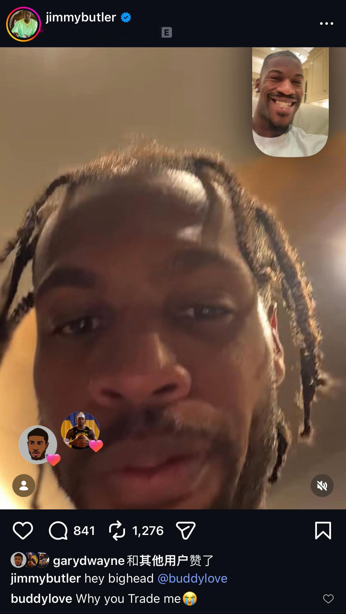 巴特勒ins晒出和巴迪的视频聊天截图,并配文:嘿,大头鬼