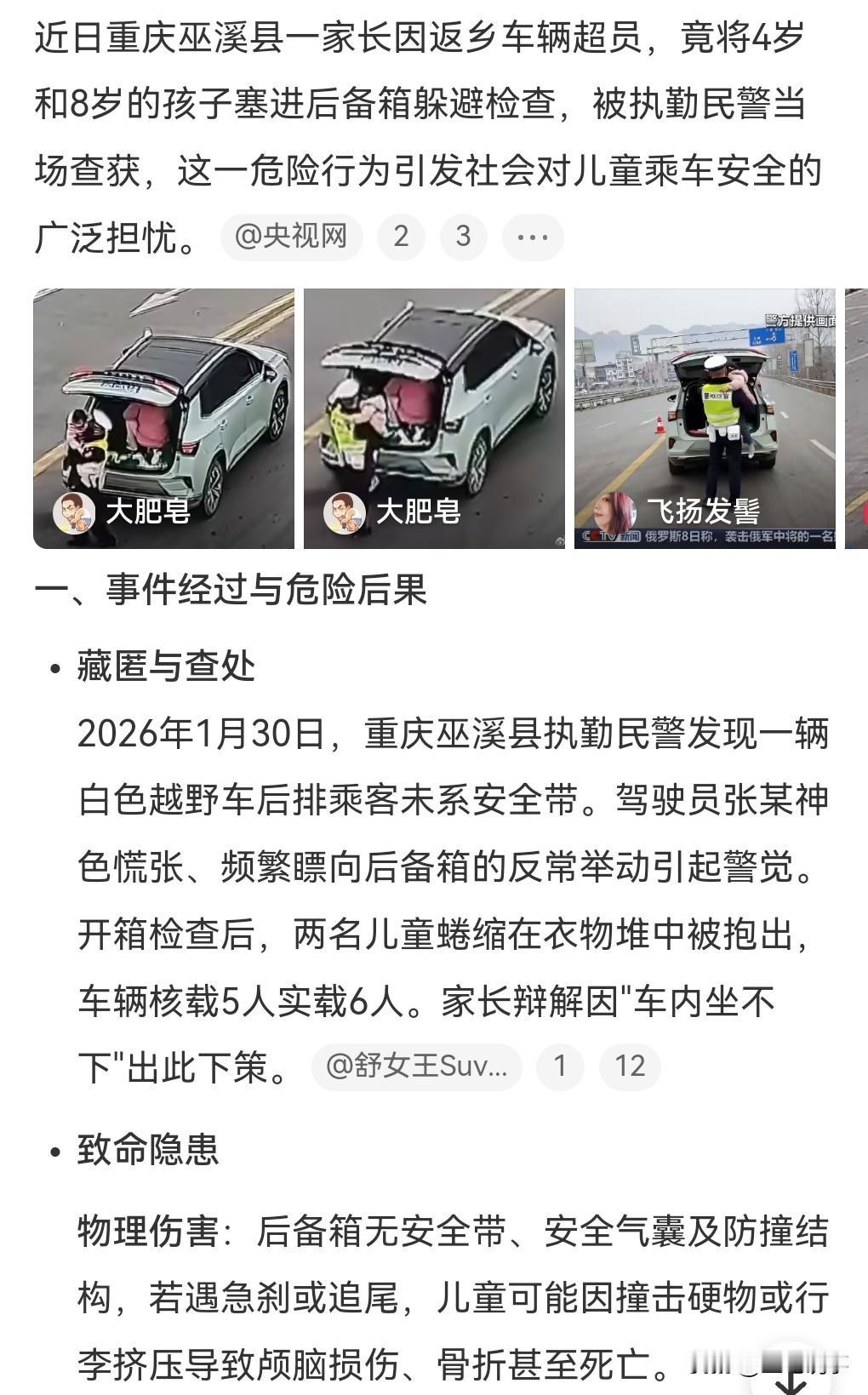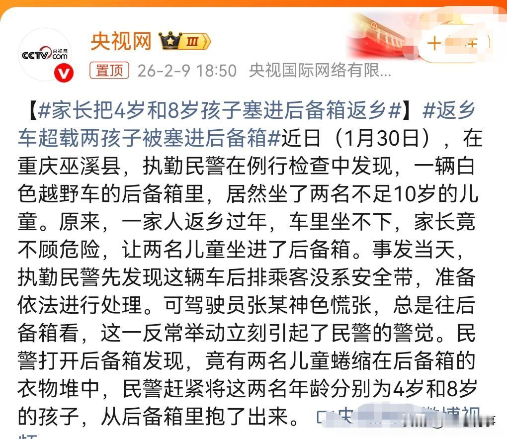 这真的是心太大了,侥幸心理很强啊,也是对孩子生命的不负责任。 1月30日,重庆巫溪县,交警发现有家长把4岁和8岁孩子塞进后备箱返乡。 这可不是儿戏啊,得必须惩罚才行。 这要是出了事故的话就麻烦了,所以说还是不要做这种超载的事。 遵守法规很重要,法律是用来保护我们的。