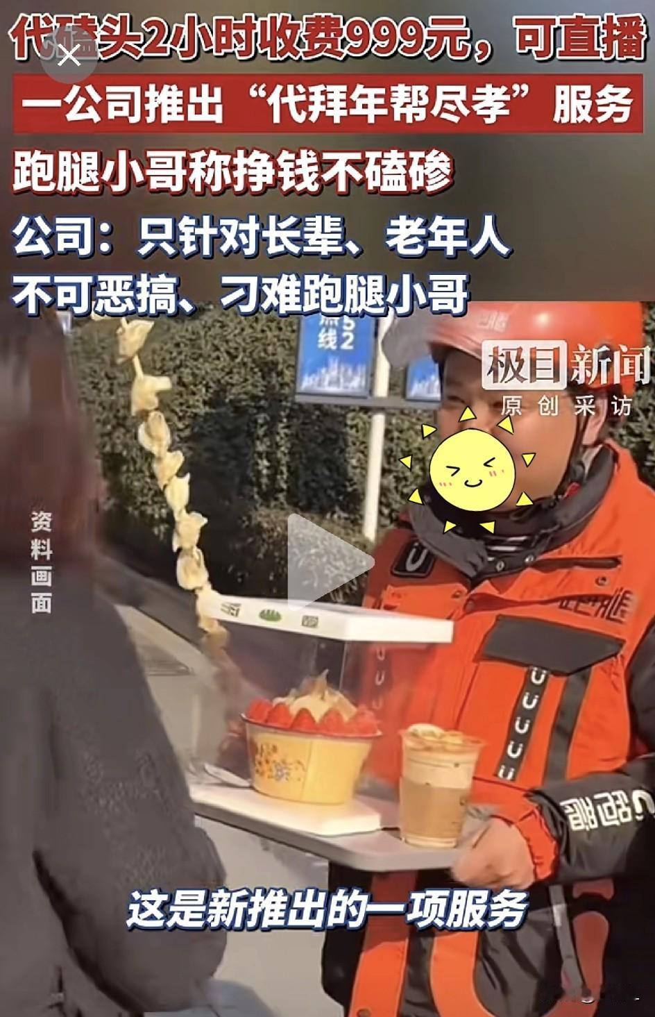 代磕头拜年服务爆火,跑腿小哥:挣钱不磕碜!已有90位客户下单999元套餐。 大过年的,河南一家跑腿公司整了个“活”:只要你掏钱,代贴春联、代送年货、代磕头拜年……甚至还能直播!消息一出,直接冲上热搜! 这服务分三档:39元起贴春联送福字、199元起代送年货说吉祥话、最猛的“代磕头”套餐999元起,送年货+磕头祝福+实时直播,10小时套餐要1399元!页面显示已90人下单。 网友吵翻了: “磕头还能代?亲情也能网购?” “纯属噱头,孝心是能花钱雇的吗?” “贴春联拜年还行,磕头实在接受无能……” 跑腿公司工作人员说,不是噱头,这是“有温度的即时服务”,全国已上线,持续到正月十五。 同时强调:代磕头只面向长辈,不能恶搞、不能低俗。 在长沙跑腿的王小哥过年不回家,已经接了个“代拜年”订单。“客户在广东回不来,让我穿精神点去他家拜年。” 面对争议,他说:“这也是份心意,挣钱不磕碜,磕头服务我也能接。” 一边是“花钱尽孝”的新模式,一边是“亲情无价”的老传统。你会买单吗? 素材来源:极目新闻,侵联删! 带定位晒今日生活 我的今日状态:💰期待暴富 我这里的天气:☀️晴天