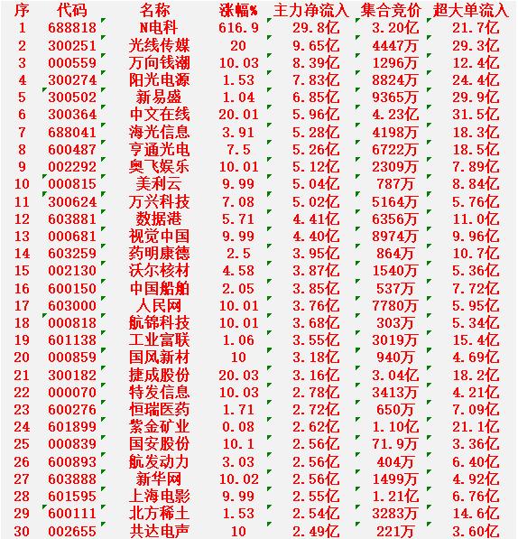 2月10日尾盘30分钟,主力资金“大幅抢筹的”30名单一览! N电科:净流入 29.8亿元,超大单流入 21.7亿元 光线传媒:净流入 9.65亿元,超大单流入 29.3亿元 万向钱潮:净流入 8.39亿元,超大单流入 12.4亿元 阳光电源:净流入 7.83亿元,超大单流入 24.4亿元 新易盛:净流入 6.85亿元,超大单流入 29.9亿元 中文在线:净流入 5.96亿元,超大单流入 31.5亿元