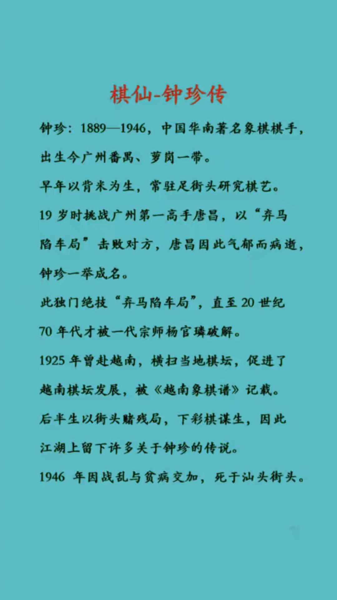 民国江湖棋仙钟珍 一个活在棋枰与市井夹缝中的名字。他不是庙堂之上的棋坛宗师,而是裹着满身烟火与迷雾的江湖棋仙。他的一生,如一步诡谲莫测的飞刀,划破了清末民初华南棋坛的天幕,留下了一道独特而凄凉的轨迹。 他的身世,便是第一重谜。是家道中落的富家子,还是避祸隐迹的旗人?无人确知。世人只识得那个肩搭米袋的“米仔”,或在油坊劳作的“卖油郎”。象棋,成了这个孤苦少年对抗命运唯一的剑。十九岁那年,他执此剑,以日日观摩、夜夜拆解得来的“弃马陷车”局,一击刺穿了广州霸主“老虾”唐昌的不败金身。此战不仅令他封神,更以对手的郁悒离世,为其传奇平添了几分宿命的寒意。 自此,他以棋为生,漂泊江湖。棋艺是他的立身之本,其风格独树一帜,全在一个“诡”字。他不尚正面强攻,专精设陷诱敌,算度深远如布幽冥之阵。那“弃马十三着”便是其战术精髓的凝结,六成胜局赖此谋得。其残局造诣更是通玄,在安南(越南)弈游时,竟能深夜独对古谱《百局象棋谱》,勘破“雪拥兰关”原谱和局之漏,一步“卒1平2”扭转乾坤,赢得“安南棋仙”尊号。这是对传统的深刻理解,更是敢于突破的创新魄力。 他的江湖气,则让这份传奇多了争议与鲜活。为引“粤东三凤”之首黄松轩出手,他导演了一场“隔空对弈”:自己匿于幕后,以丝线牵引前台傀儡行棋,终使轻敌的黄松轩连折三局。对阵李贵时,又佯装失手悔棋,实则以“失误”为饵,激得对方加注,而后从容取胜。这些“诈术”,是底层棋手挣扎求存的生存智慧,也让他的形象在“仙气”之外,沾染了浓厚的草莽机锋。 然而,旧时代江湖棋人的命运,终究难逃风雨飘摇。晚年的钟珍流落汕头,生计无着。战乱、贫困,加之鸦片蚕食,最终将这位曾名动华南、弈惊异域的棋仙,推倒在寒风凛冽的街头,潦草谢幕。卒年成谜,唯余叹息。 若要评断钟珍,他绝非棋坛“正统”典范,却是一个不可或缺的异数。他将象棋从案头雅趣彻底拉回人间巷陌,使之成为谋生利器与生命寄托。他的“诡”与“绝”,极大丰富了象棋的战术维度与艺术表现力。其不拘一格的创新思想,通过弟子陈松顺,间接影响了后来的“魔叔”杨官璘,薪火暗传。 他的一生,是江湖棋人命运的缩影:在技艺上可以登峰造极,在生计上却不得不委身尘土;行事游走于机巧与争议之间,而对棋道的执着与热爱,却是其颠沛生涯中不变的内核。他没有留下系统的著作,身世成谜,故事亦真亦幻,恰是这份不完美与神秘感,让“棋仙”钟珍成为一个极具辨识度的传奇符号——他证明了,象棋不仅是智慧的游戏,更是底层生命在方寸之间,迸发出的最顽强、最灵动、也最复杂的人性光辉。