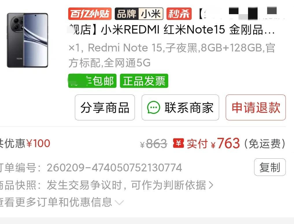 我本来并不想买红米note15这款手机,当时想买红米note14pro这款,它有光学防抖,和NFC就是碰一碰功能,基本符合我的日常需求! 但是14pro的价格一直在一千以上坚挺着,而15的价格开始有了大幅度补贴,于是,不等了,趁着国补下单了,挺惊喜的,七百多元,还要啥自行车! 我选的8+128款,不玩游戏,就是购物发文使用,足够了。 之前一直用8pro,掉水里了,只好换一下。 手机 红米note15