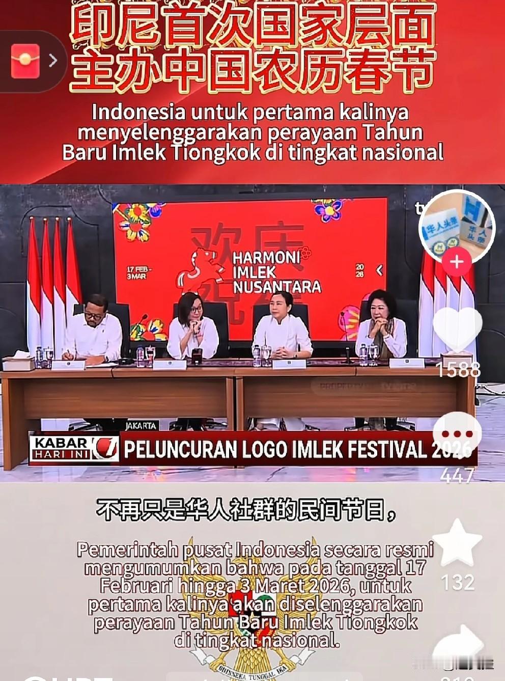 印度尼西亚政府官宣于2026年2月17日至3月3日由政府主办春节,不再是华人社群民间的节日,是印尼中央政府举办的全国性节日。 这对很多华人华裔华侨来说都是喜讯。他们虽然过年的喜庆味道一样,但这种乡情民俗的文化味道不一般。 海外华人也都是在几百年间因为当时的中国积贫积弱,为生活背井离乡去海外讨一口饭吃,他们不忘本,不忘根,在所在国以中国人固有的勤劳智慧打拼,也念念不忘自己的文化和民俗,于社团民间里过中国传统节日。囿于当地政府的成见,也囿于祖籍国还未强盛到让居住方政府心悦诚服,他们也是举步维艰地坚持自己的文化活动。 而现在,中国以世界第二大经济体身份,博得全球瞩目,以软硬实力扮演者世界和平维护者的角色,让远在海外的华人华侨挺起腰板大胆拥抱自己的文化了。现如今大多数国家也都顺应华人族裔需求,把春节列为当地的节日或者为公众假日,确实让人欣慰。