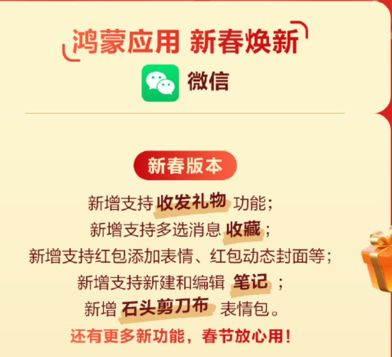 鸿蒙版微信这次更新真是“马”力十足,新增了20多个新功能!发红包更有意思了,除了能添加表情、红包动态封面等,还有个“微信礼物”的新玩法,让心意表达得更特别 鸿蒙微信年前重磅更新