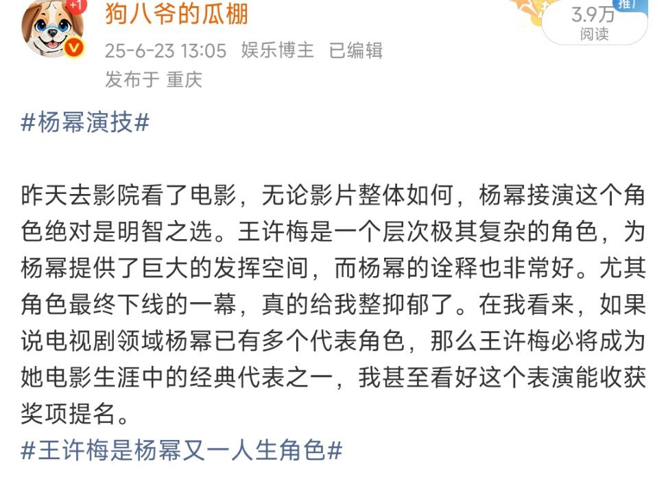金像奖提名王许梅的含金量还在上升,不为自己没提名而遗憾,反而因为别人没提名而高兴,从根本上来说某些人就输了。酱园弄当时我去看了,电影里面最令人映像深刻的角色就是王许梅,后面王许梅全网无差评,都是被这个角色感染的,证实了我的想法没错。难怪现在所有人都在讨论为什么王许梅没提,看来观众的眼睛是雪亮的