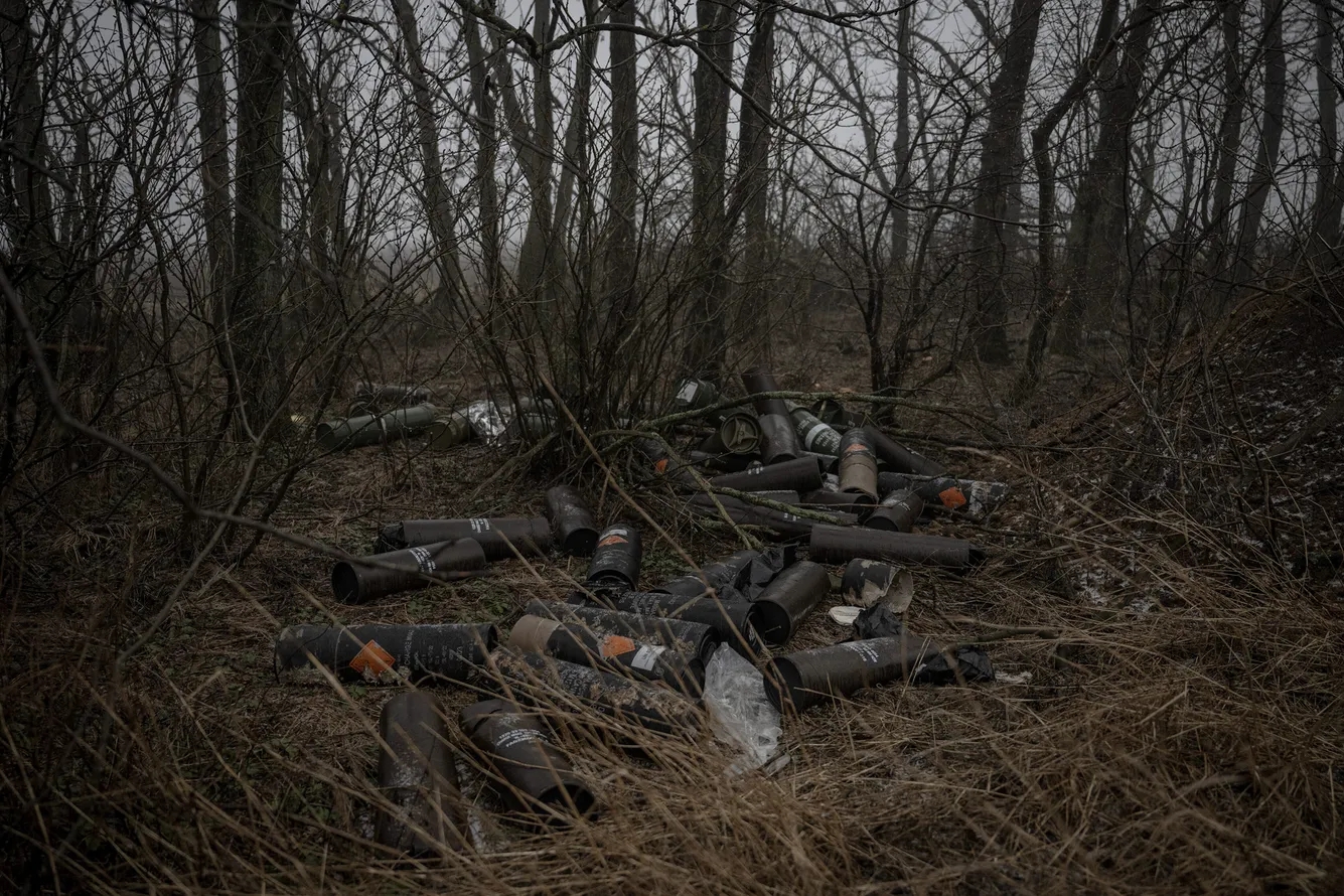 巴赫穆特附近的乌克兰炮兵阵地,一地的炮弹弹壳。