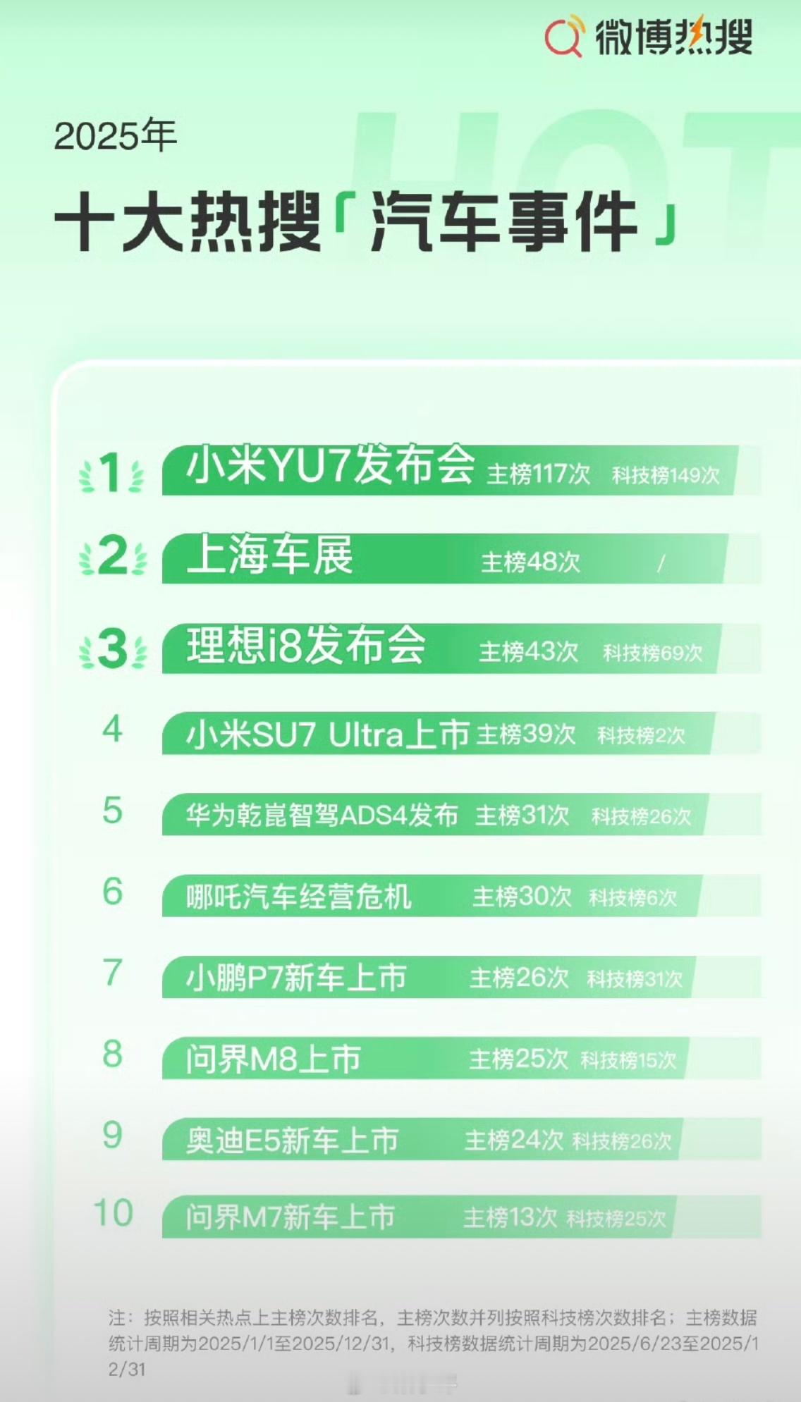 2025年十大热搜汽车品牌:小米汽车,326次鸿蒙智行,220次特斯拉,120次
