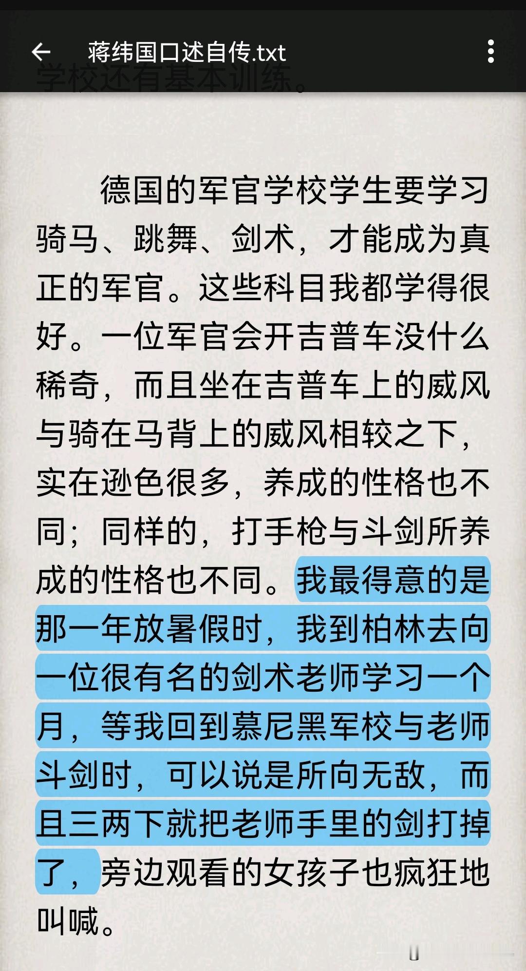 省流版: 【蒋纬国在暑假里只练习了一个月的斗剑,回到慕尼黑军校之后就能很轻松地把老师手里的剑打掉了。】 我嘞个慕尼黑军校小剑圣啊。 当时德国军校的剑术训练不是娱乐活动,而是一种近乎残酷的荣誉训练。 “学院决斗剑”是德国传统学院击剑的专用武器,剑身厚重、不开刃,主要用于劈砍,而非刺击,有像篮子或者钟罩一样的包裹着整个手部的巨大金属护手;握柄粗,通常为木质或皮革包裹,摩擦力大,便于抓握,且抓得非常牢;剑身重,抓不紧根本挥不动,这种剑天生就极难被打脱手,是一种已经高度完善的器材。 学院决斗剑的核心规则是双脚必须固定:只能站在原地,不许前后移动,剑只能用劈击,禁止刺击;只能小幅挥剑与格挡,完全没法靠步法找角度发力。 而德国军校击剑教官是那种有十几年经验的老手,天天教、天天练,说他们的剑术炉火纯青也不为过。 德国军校斗剑从头到尾没有“打掉剑=赢”这条规则,打掉对手的剑毫无意义。斗剑的时候双方脸对着脸,剑劈过来不能躲不能闪不能退,比的就是敢不敢挨刀,能不能在对方脸上划出伤口。 “三两下就把老师手里的剑打掉了,旁边观看的女孩子也疯狂地叫喊”,你当这是武侠小说呢?