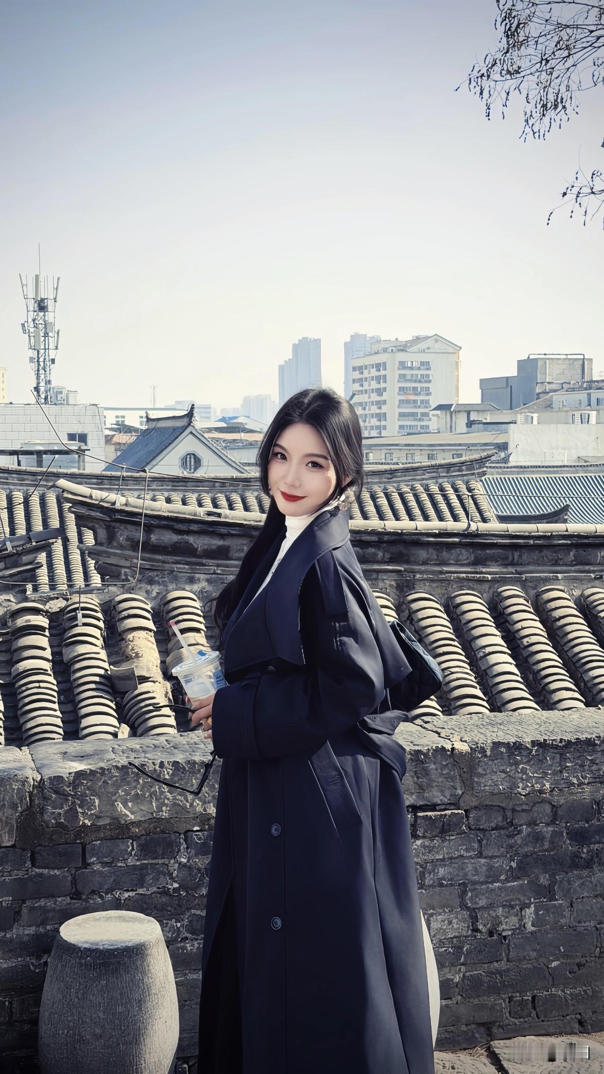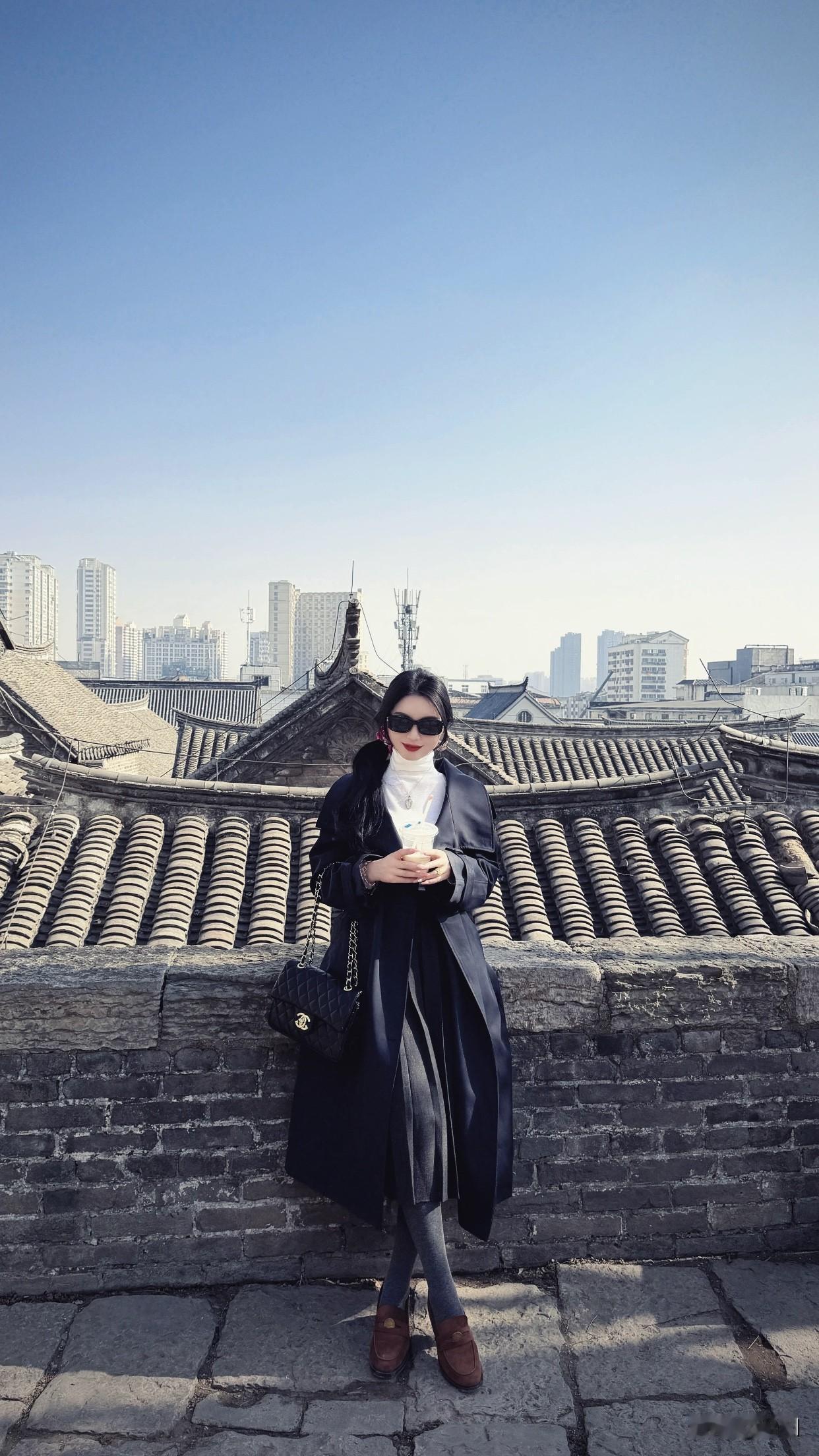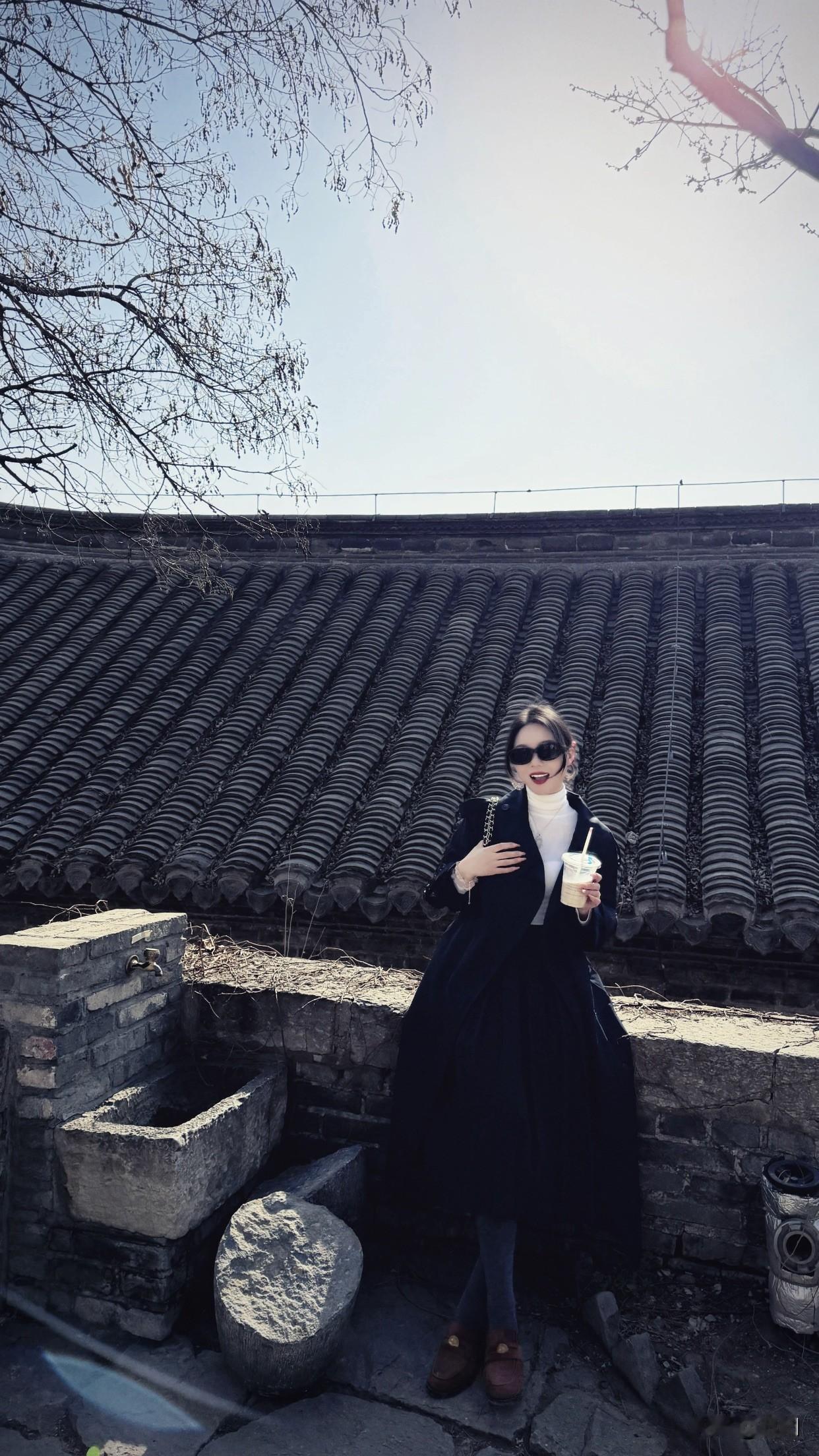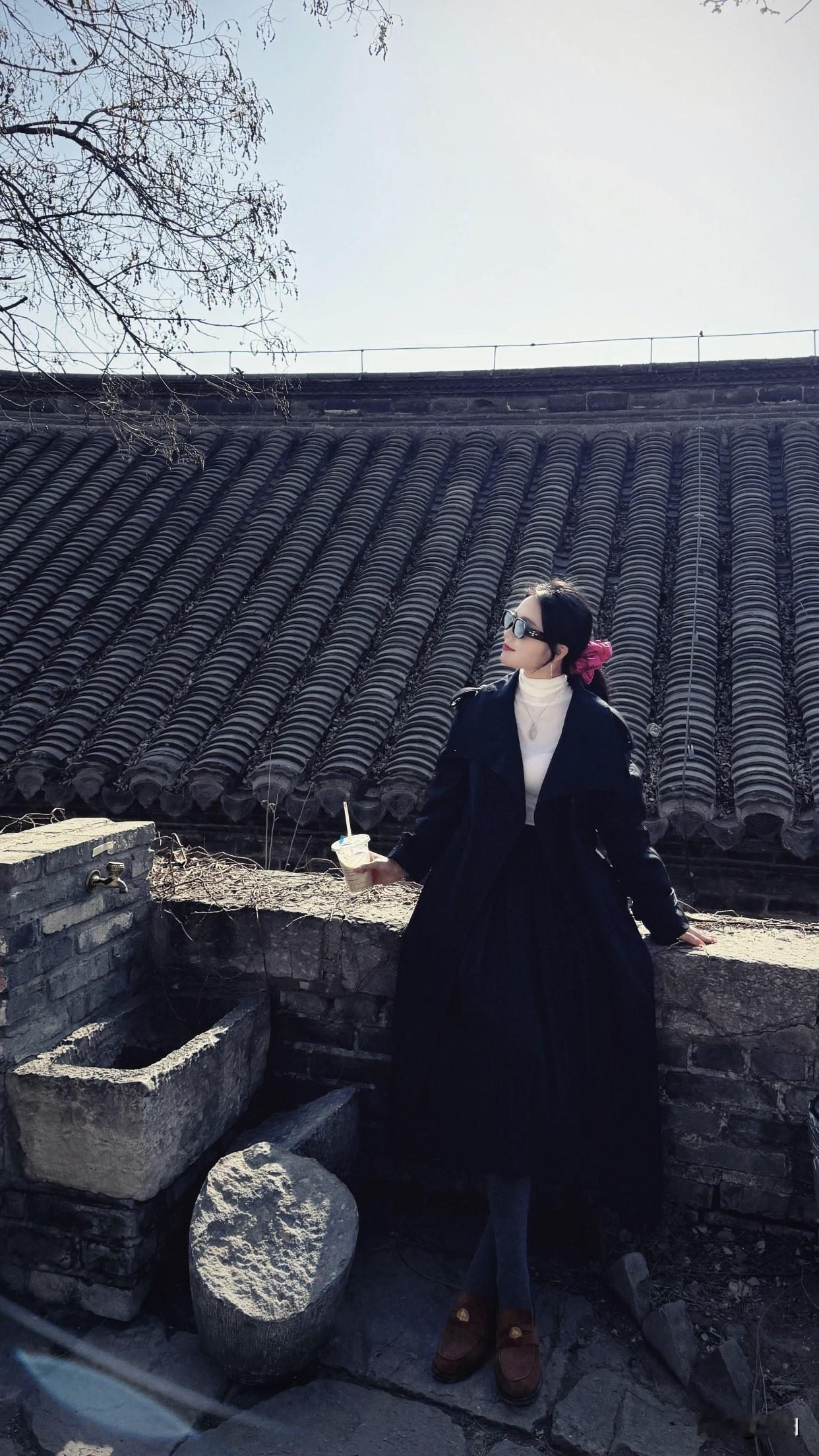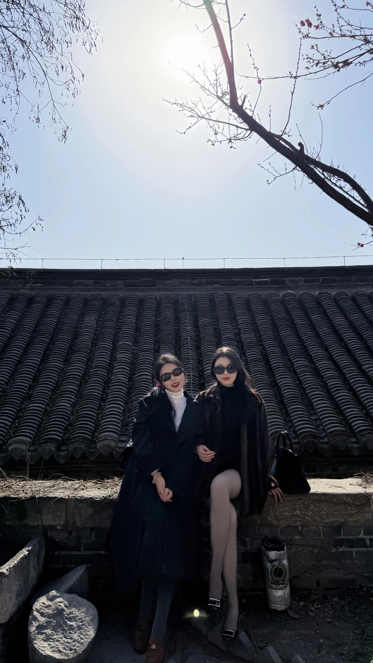 女生怎么搭配服装才能又酷又美冬日暖阳下,闺蜜相伴,古风建筑前的美好时光。