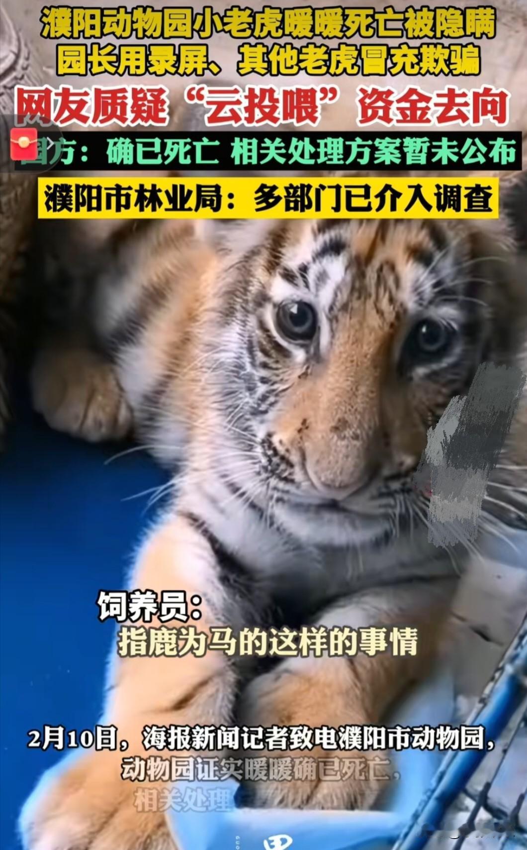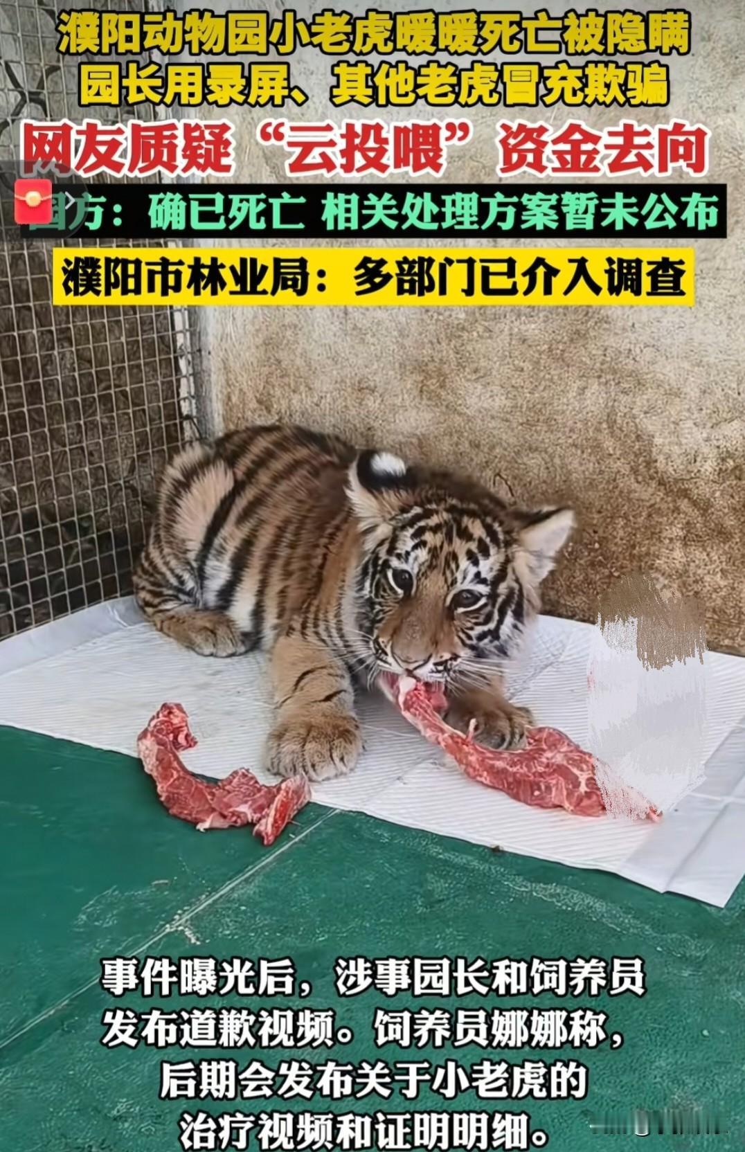 “我的善良不是生意”河南濮阳一动物园。养了只小老虎很可爱,名字叫暖暖,因他样子乖巧,长得可爱,被广大网友所喜欢。 自然而然就成了动物园里的“小网红” ,变成了动物园敛财的工具,网友们生怕小暖暖吃不饱吃不好,天天在线“云打赏” 但让人。气愤又无奈的一幕还是出现了。暖暖在1月份的时候就因为生病,不幸去世。 但是园方。并没有选择公布这一消息,而是选择了隐瞒。更可耻的是他们竟然一边用旧视频和黑屏假装直播。来收受粉丝的打赏。 不得不说其心。不可谓不黑,其行为不可谓不毒。除了旧视频循环播放直播时黑屏之外。他们竟然还找了替身。来代替暖暖出镜。 嗯,网友也不是傻子。渐渐也发现了事情的不对,在追问之下,园方总算承认了,暖暖已经死亡的事实。并且园长和饲养员都录了道歉的视频。 但迟来的道歉真的有用吗?大家。气愤的不止是被长期的欺骗,更是对投喂的钱进了谁的口袋,用在了那,表示不解。 凭什么你能把我的善良当成一笔生意? 目前当地的林业局以及很多个部门已经联合介入。开展调查,查暖暖死亡的详细情况以及与云投喂名义收来的资金去向。 这种指鹿为马的事情,你认为构不构成欺欺诈?你如何看待这个事情? 暖暖老虎 濮阳动物园