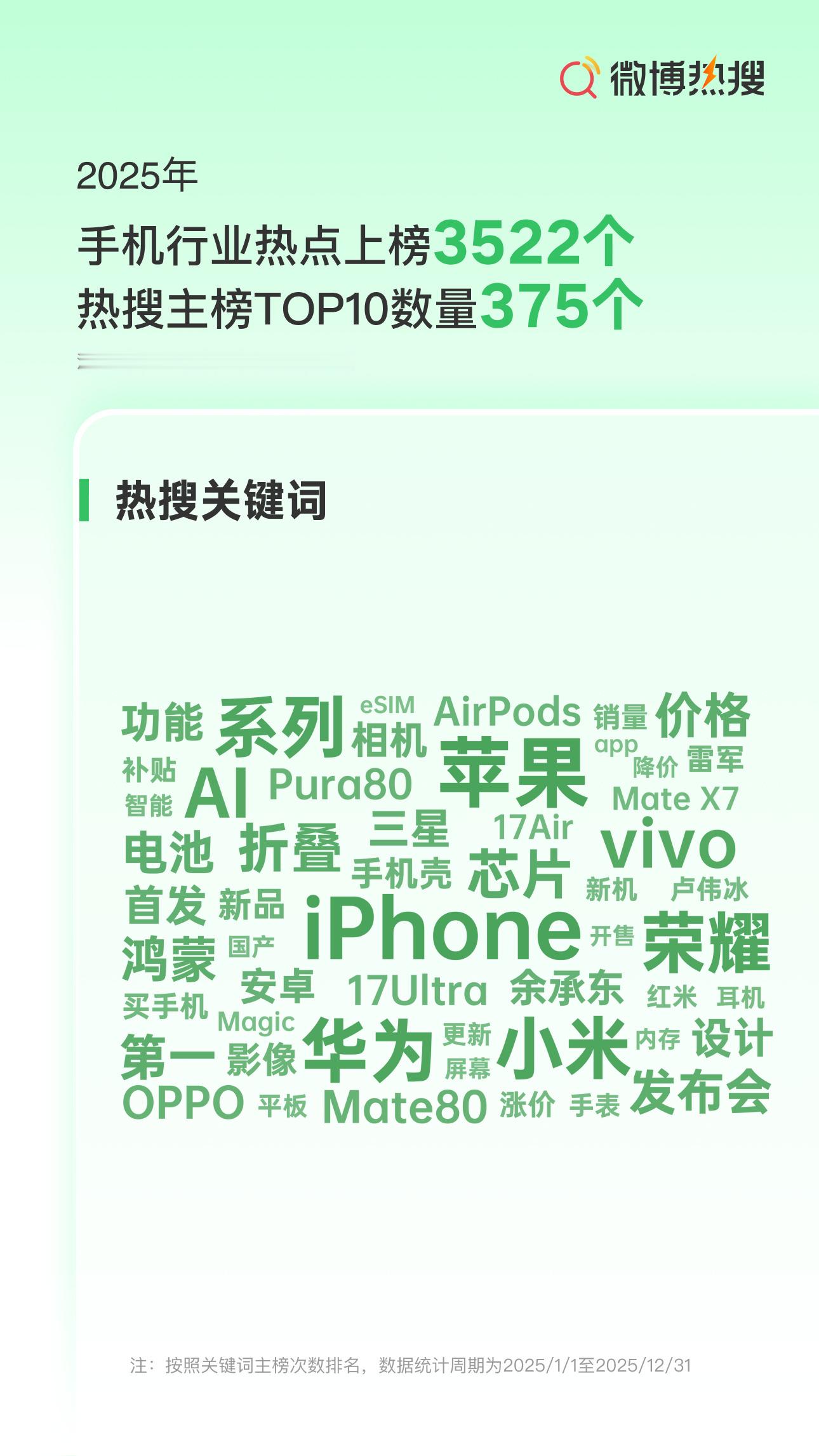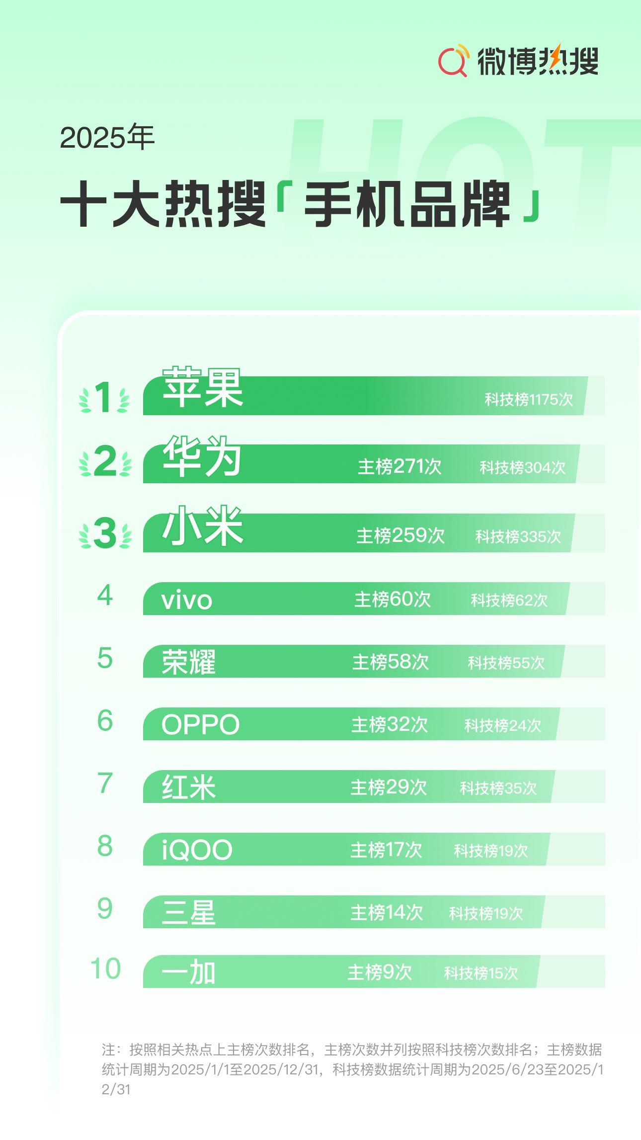 微博发布了2025微博热搜趋势报告,经常上热搜的还是苹果、华为、小米,所有手机品牌的热搜次数加起来还比不过苹果