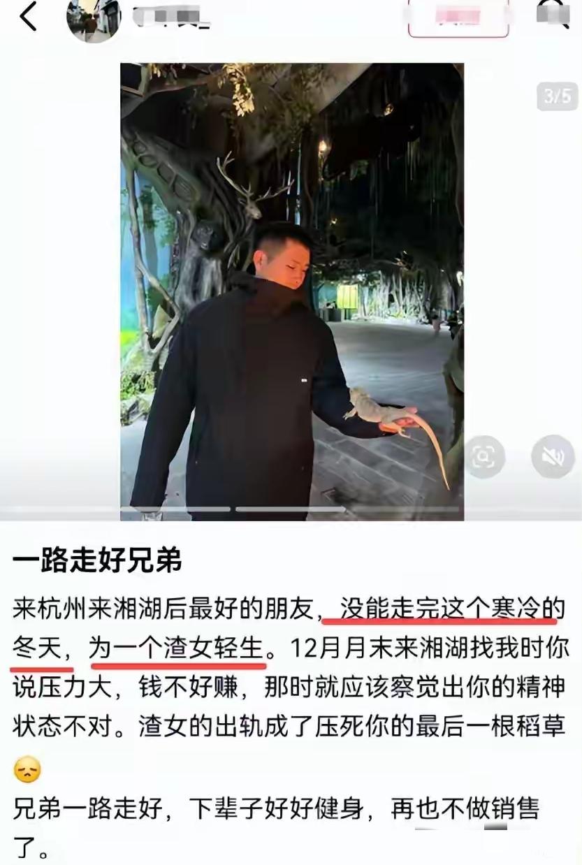 王雄威是温州人,在杭州湘湖打拼了好多年,但业绩没多少起色,钱赚的越来越少,加上妻子出轨20岁健身男子,成为了压垮他的最后一根稻草,选择了轻生,真的是太可惜了。 他毕业后就来到湘湖,做精密仪器销售工作。做销售的,平常的压力就挺大的,所以他用健身的方式对抗压力。 在他的带动下,妻子也是迷上了健身,两人经常出现在健身房,在他们健身圈也是小有名气。 结实的肌肉,完美的身材,他也经常把自己健身的视频传到网上,让人着实羡慕。 可经常更新视频的他,却断更了。 健身圈的朋友都以为他是工作忙,疏于健身,可最近的一条发圈:最后一条了。成为了他的绝笔。 很快,他轻生的消息在健身圈扩散,随之他的妻子出轨20岁健身男子的情况被扒。 原来,这个20岁男子混迹于健身房,专挑健身房的少妇下手。在他的视频内容里可以看见他略有几分帅气,经常发一些旅游的照片,以打造人设。 真的替王雄威不公,经常健身的他身材也不错啊,他也挺努力了,还是落下这样一个结果。 真的是太不值了,人生有很多条路,也有很多棵树,这条路行不通可以换条路,这树不属于你,那就不要留恋,再换一棵树。 现在第三者的社交账号被扒,都跑到他评论区评论,目前已经成了私密账号。 30岁的年纪,正是打拼的年纪,把自己留在了这个寒冷的冬季。最伤心的是他的父母,白发人送黑发人。