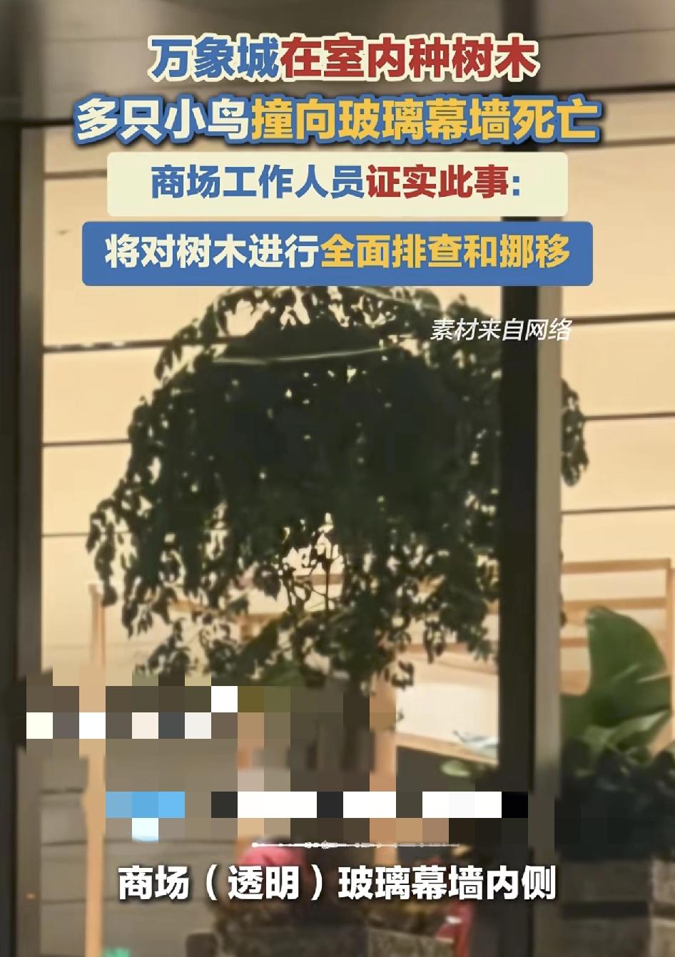 西安万象城大门外,有网友发现,有数只被撞死的小鸟,网友推测在万象城大门内部有不少种植的树木,很有可能这些小鸟想飞进万象城内部的树木,但是未能查看到有隔离的玻璃,所以飞过去的时候,撞到玻璃而身亡。万象城工作人员表示会尽快的排除这些安全隐患,并将对部树木进行挪移和加装防撞贴。