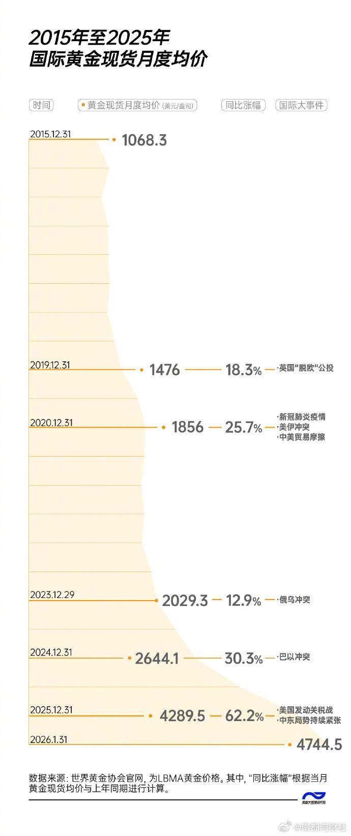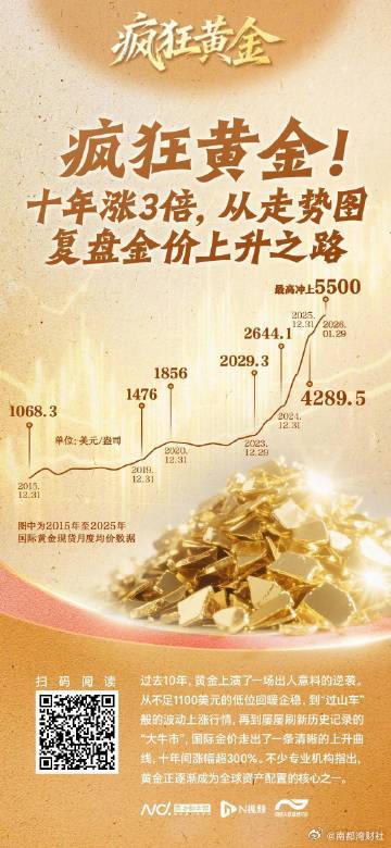 #黄金十年从1000美元涨至5000美元#【#黄金十年涨3倍#!#从走势图复盘金价上升之路#】进入2026年,黄金价格继续“狂飙”。2026年1月底,国际现货金价突破5500美元/盎司关口,尽管后续经历价格急坠,但很快又回升至每盎司5000美元上方。南都大数据研究院梳理发现,过去10年,黄金上演了一场出人意料的逆袭。从不足1100美元的低位回暖企稳,到“过山车”般的波动上涨行情,再到屡屡刷新历史纪录的“大牛市”,国际金价走出了一条清晰的上升曲线,十年间涨幅超300%。不少专业机构指出,黄金正逐渐成为全球资产配置的核心之一。