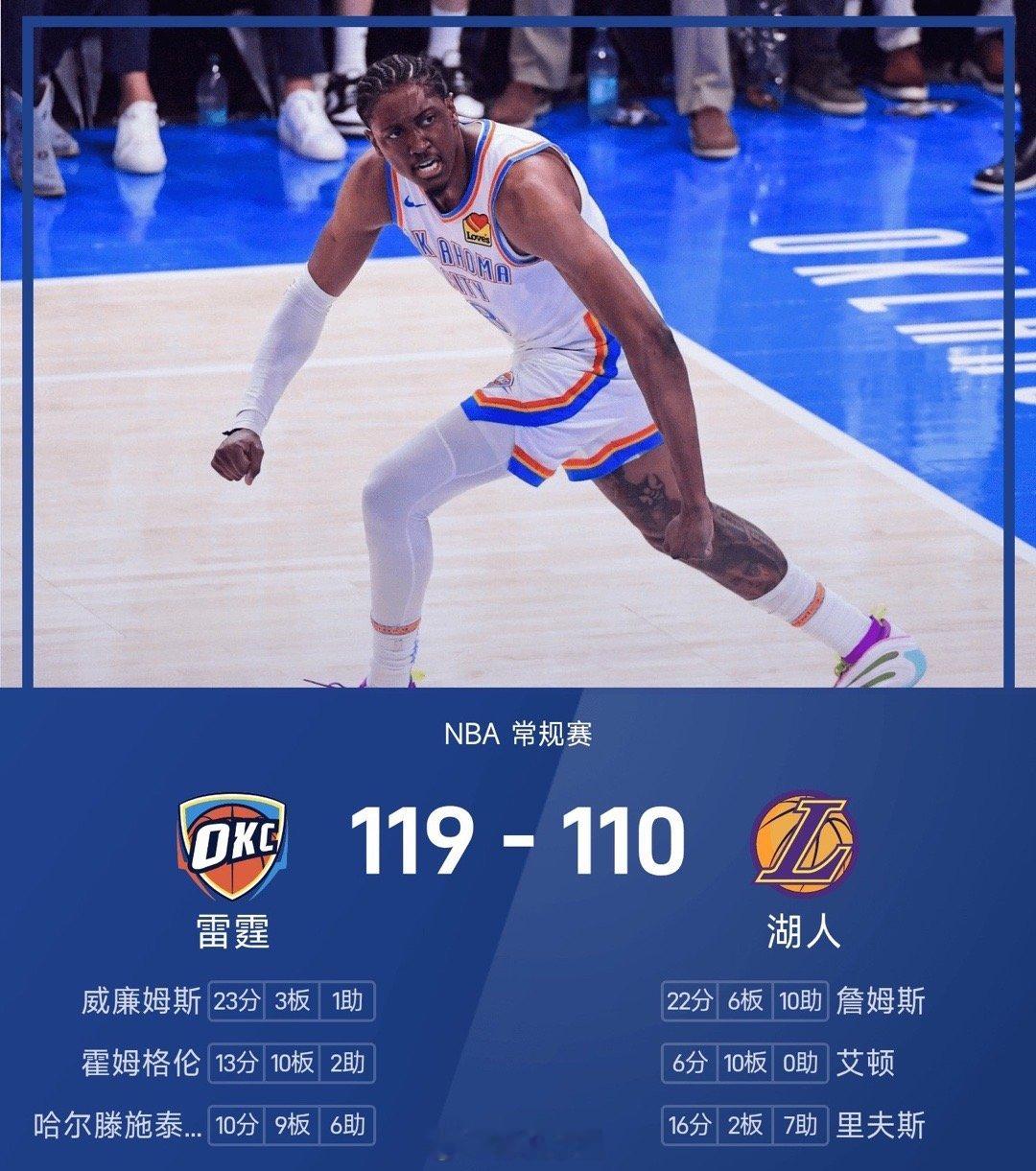 25/26赛季NBA 常规赛,湖人对阵雷霆。双方全场战罢,湖人110-117不敌雷霆。杰伦·威廉姆斯复出砍下全场最高的23分2板1助,率领雷霆成功取胜,詹姆斯空砍22分10助。