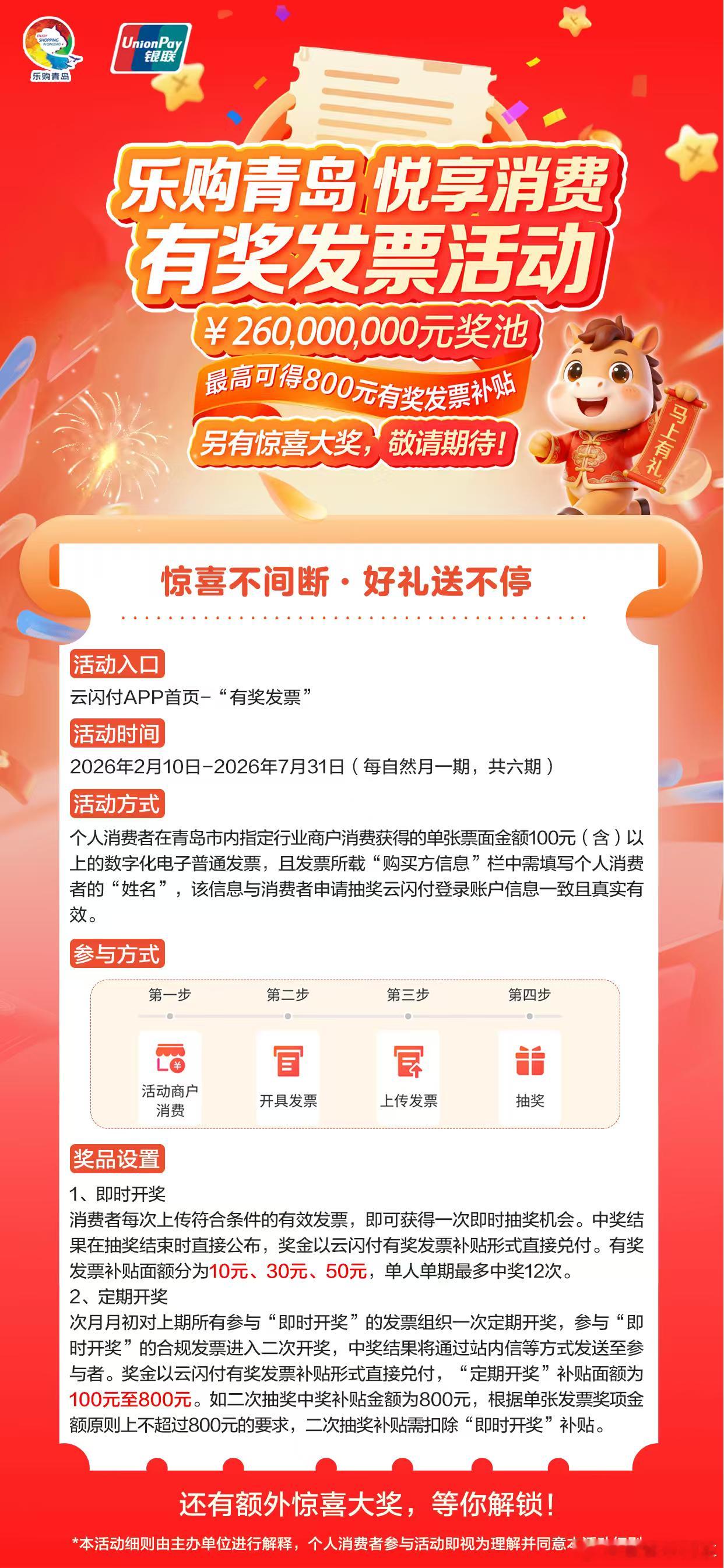 最新消息!青岛将于2月10日正式启动有奖发票活动,持续至7月31日。本次活动总奖池高达2.6亿元,共分6期开展,每自然月一期。首期活动将覆盖青岛市内零售(不含水、电、气发票)、餐饮、住宿行业指定商户;二期至六期将扩大至文化艺术、娱乐、旅游、体育、居民服务业等行业商户,让您在更多消费场景中遇见新惊喜。