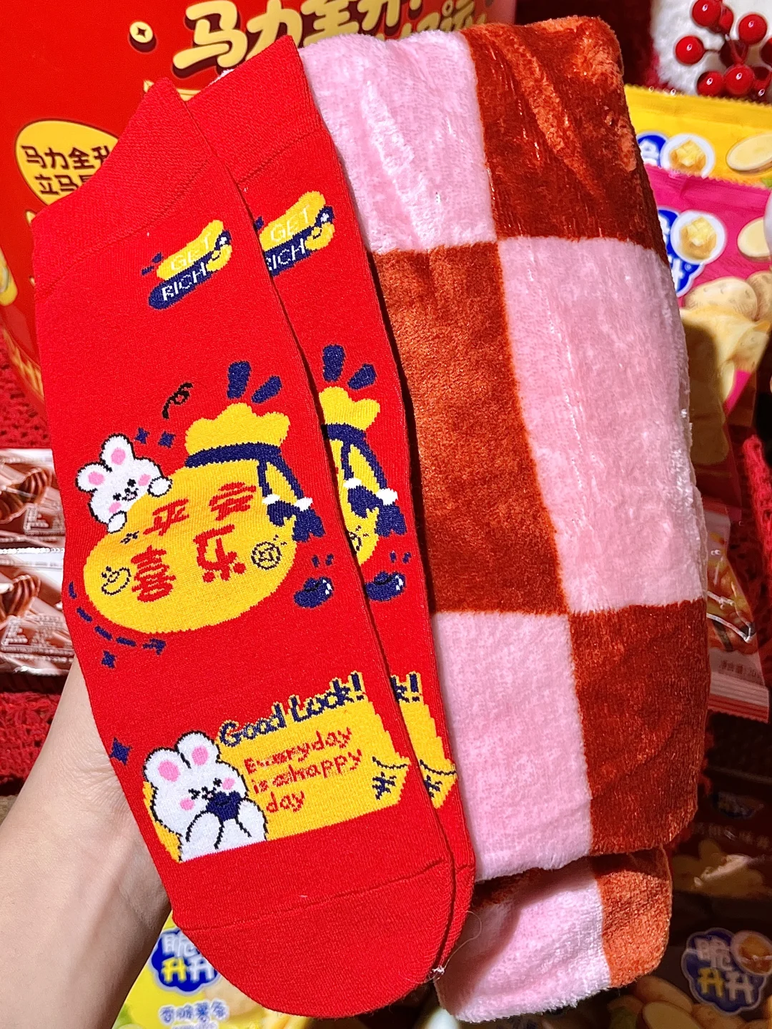 重点是居然还送新年周边🎁 软fufu的贴贴绒毯,冬天窝沙发追剧裹着暖乎乎超舒服~还有颜值在线的红运新年袜,踩在脚下感觉好运直接拉满✨