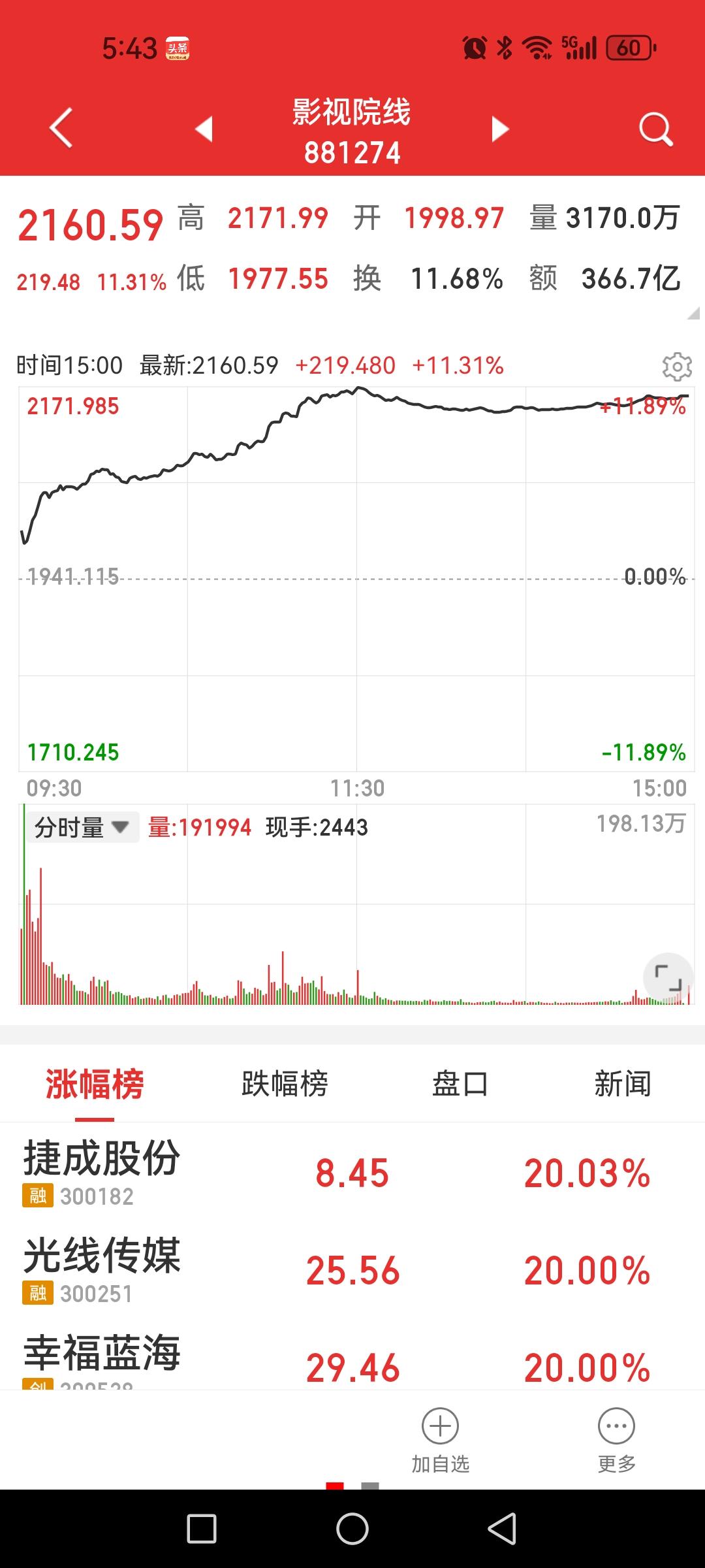 实在没炒的了游资就猛干一个板块。 影视院线居然大涨超10%,涨停板满屏都是,能