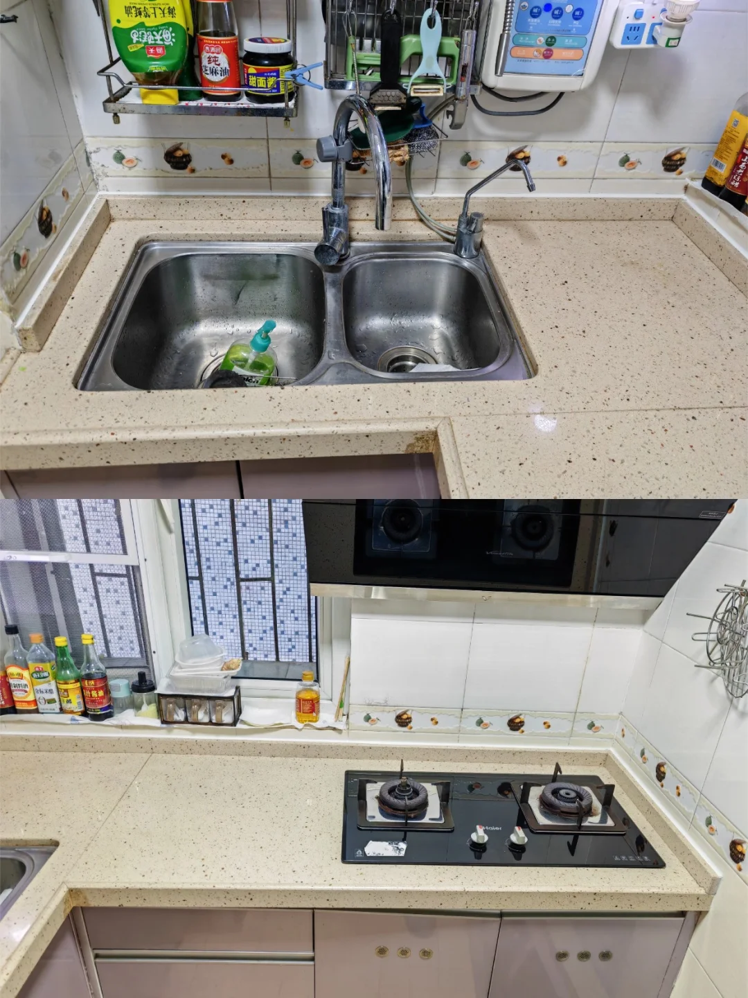 👉用的是德国汉高百得的胶(百年品牌,防霉抗污超耐用),旧胶全铲,橱柜/洗手台/柜体都覆盖,不限米数!