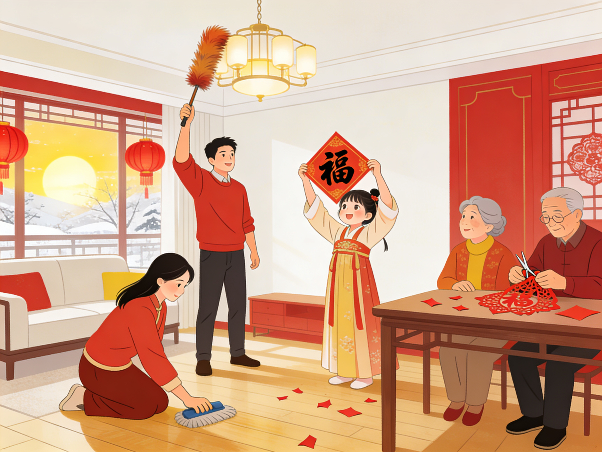是"扫尘日"全家总动员,把积攒一年的灰尘扫出门,"除陈布新"不只是清洁,更是把晦气留在过去,让屋子亮堂堂地迎接新春。孩子贴歪的窗花、老人剪的福字,都是亲手布置的仪式感。
