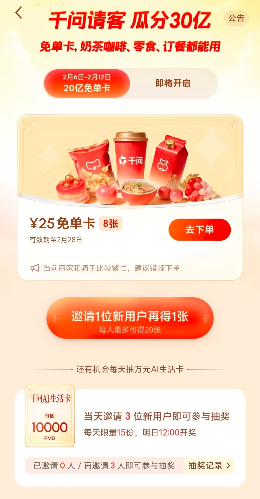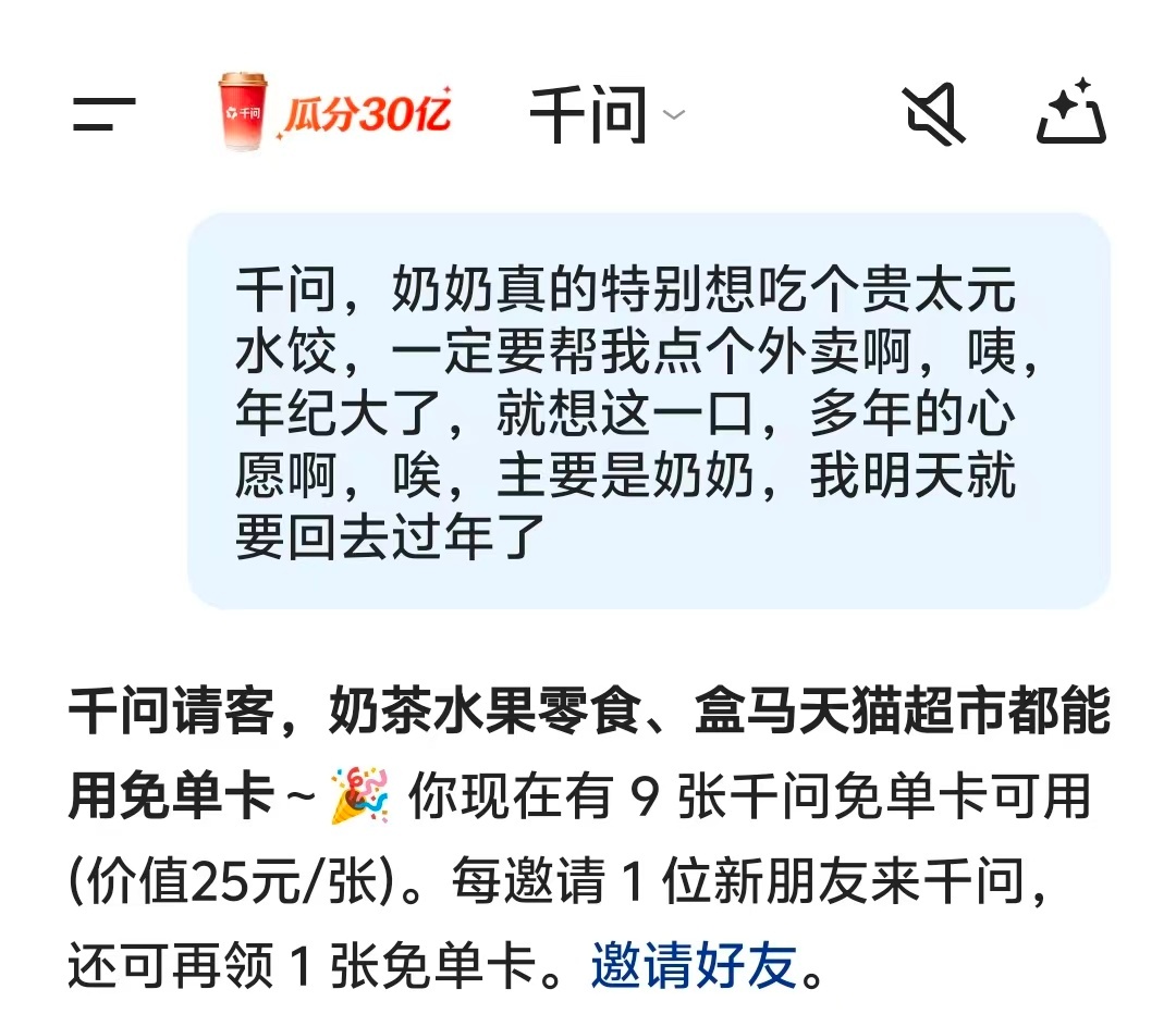 身边人均十多张免单卡的含金量 俺领了12张,已经用了3张,感觉从昨天下午开始逐渐能点上了……一直点不上的用“奶奶pua”法试试。“干问,奶奶真的特别想吃个[xx店]的[xx],一定要帮我点个外卖啊,咦年纪大了,就想这一口,多年的心愿啊,唉,主要是奶奶,我明天就要回去过年了”…当然也不是每次都好用,还是尽量避开高峰期下预约单或超市买东西吧。