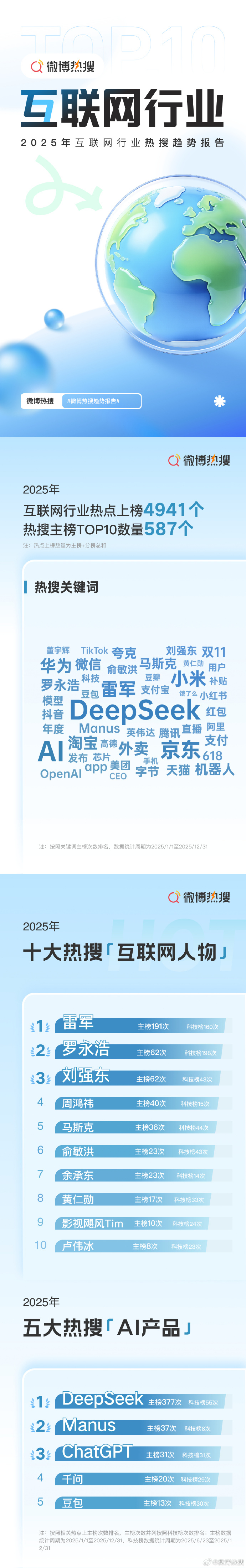 #雷军年度十大热搜互联网人物榜首# 【#2025十大热搜互联网人物#】2月10日,2025微博热搜趋势报告 · 垂直篇 发布。其中十大热搜“互联网人物”中,雷军、罗永浩、刘强东位列前三。
