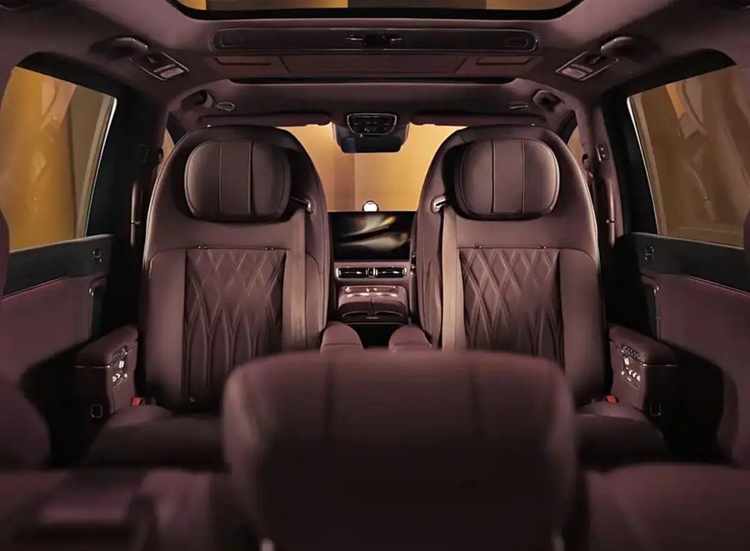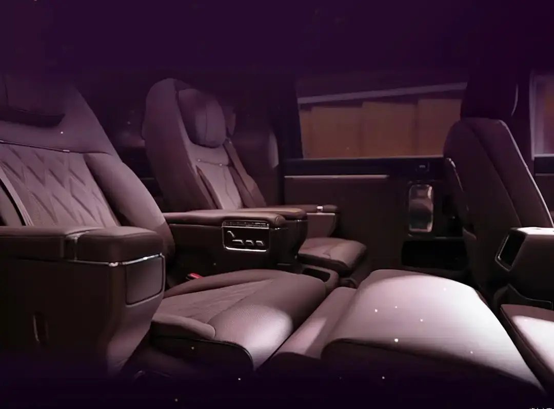 内饰方面,智界 V9 提供绒霞紫配色方案,采用一体式横向贯穿屏幕设计,并选用白栓木与胡桃木等天然实木饰板,保留原木纹理质感。中控台下方设有水晶旋钮,搭配 NAPPA 头层真皮材质,提升整体豪华氛围。音响系统采用 HUAWEI SOUND 方案。第二排座椅支持一键联动调节功能,可调节靠背、腿托及脚踏,实现 1.05 米超长支撑距离。此外,二排座椅具备旋转功能,支持 45 度迎宾、90 度观景及 180 度对坐等多种模式,满足商务及家庭多元场景需求。