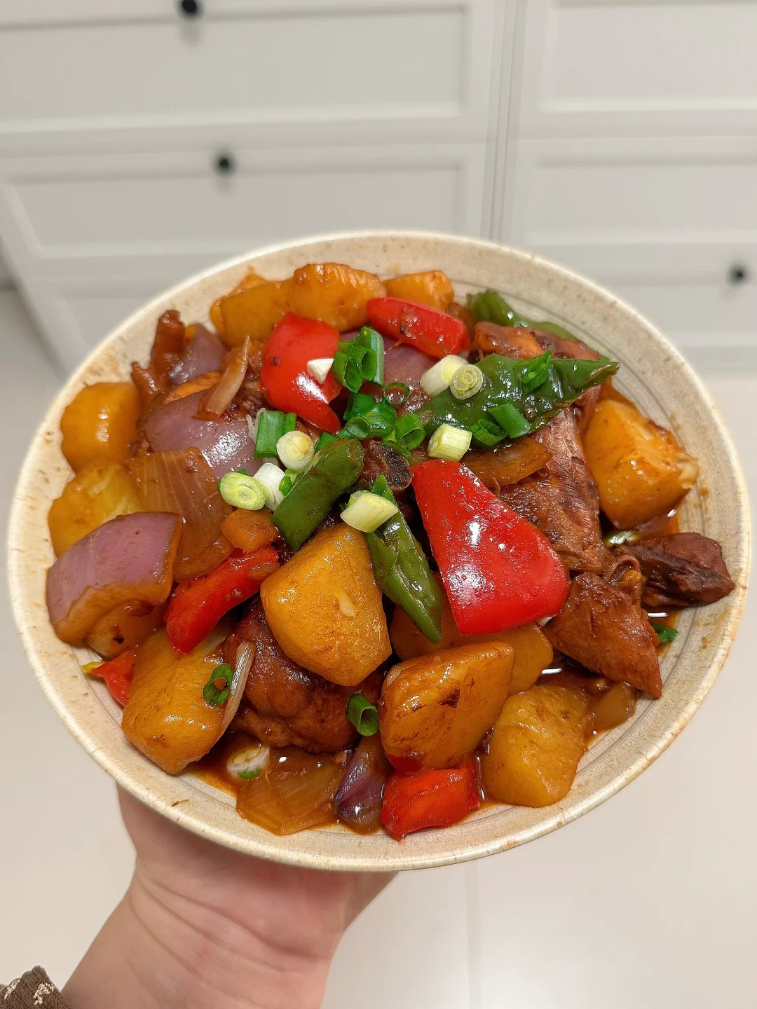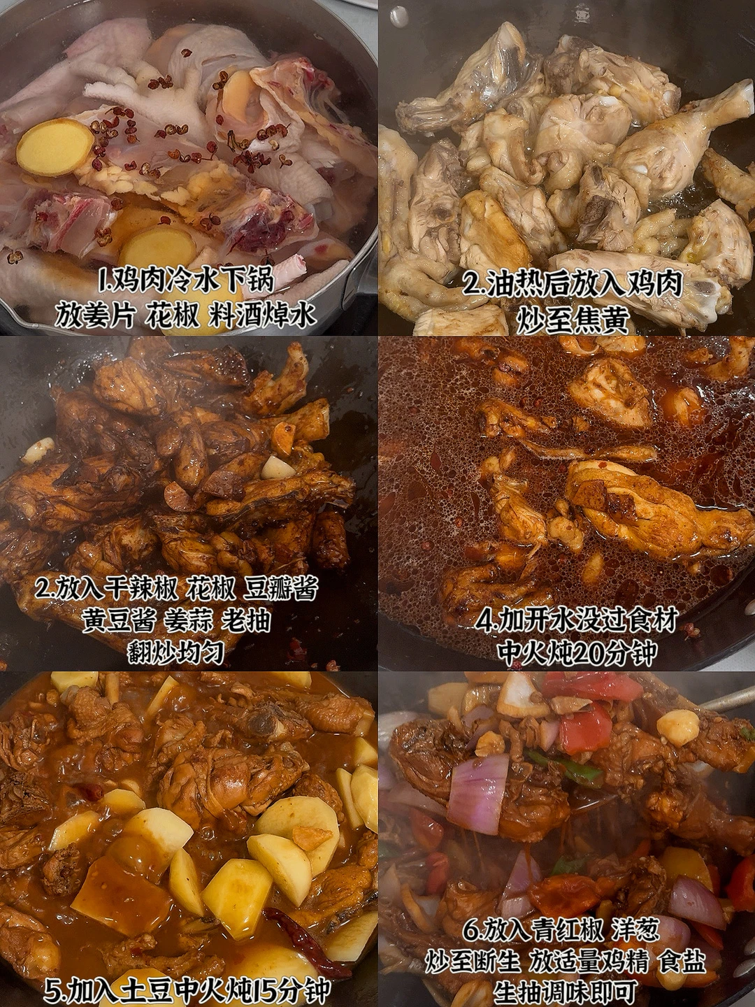 今天做家常版大盘鸡,快来试试~ 1.食材:鸡肉、青红椒、洋葱、土豆 2.做法: 1⃣️鸡肉冷水下锅,放姜片、花椒、料酒焯水备用 2⃣️油热后放入鸡肉,炒至焦黄 3⃣️放入干辣椒、花椒、姜蒜、豆瓣酱、黄豆酱、老抽,翻炒均匀 4⃣️加水没过食材,中火炖20分钟 5⃣️放入土豆,中火炖15分钟 6⃣️放入青红椒和洋葱,炒熟 7⃣️放适量鸡精,食盐,生抽调味即可。