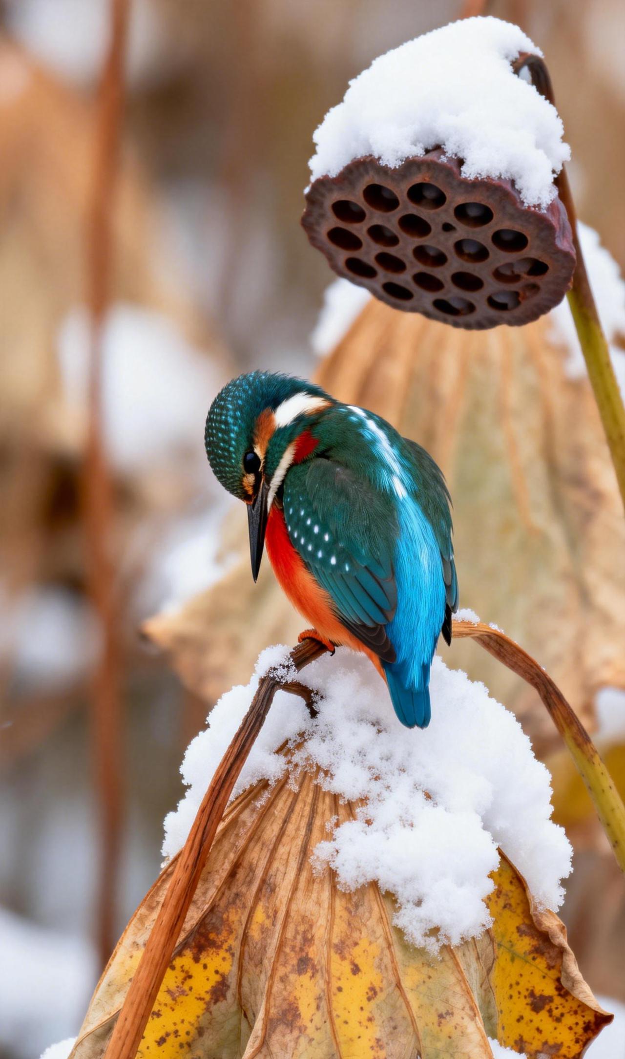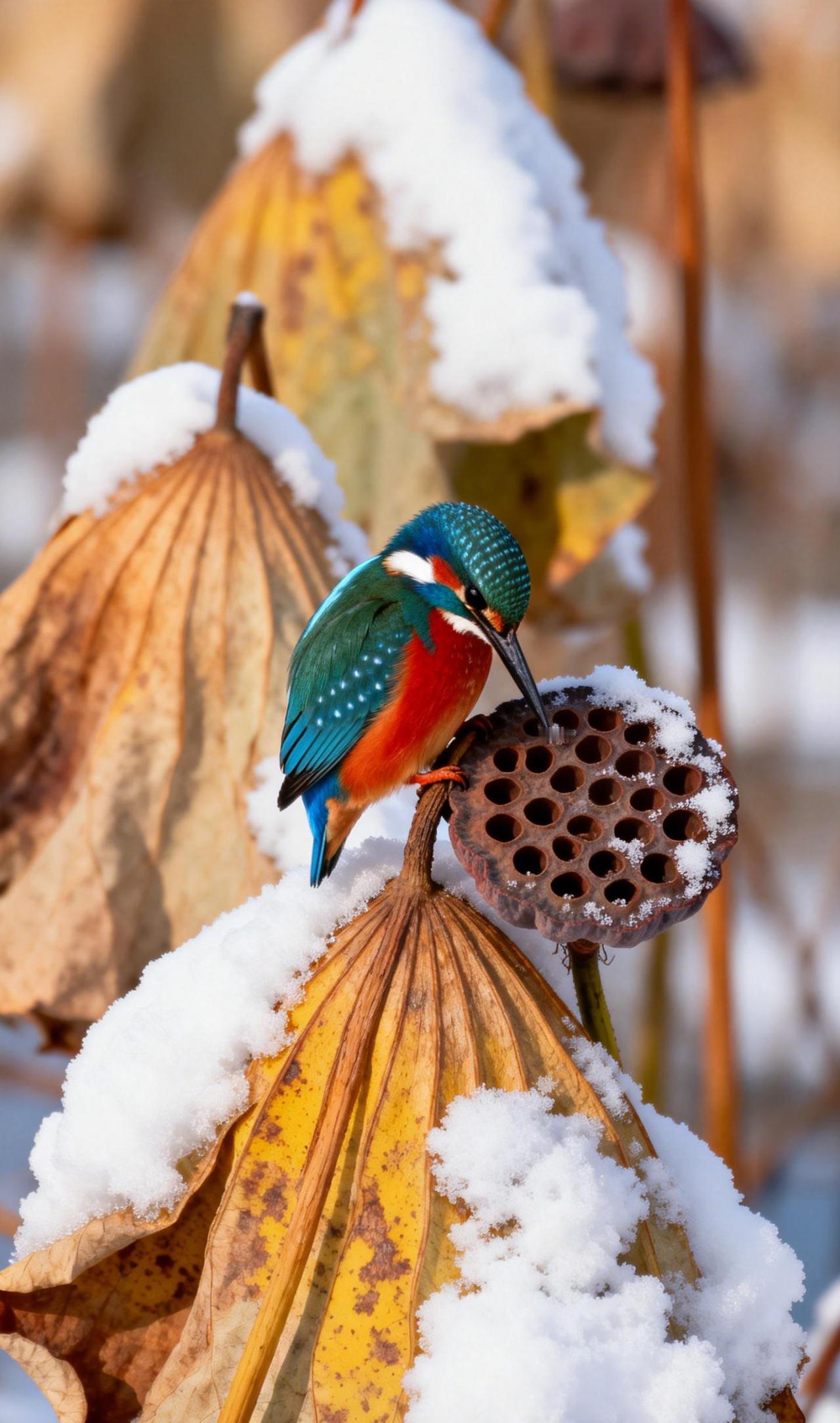 残塘惊玉屑,翠羽啄冬声 冬日的荷塘褪去喧嚣,残梗垂首,莲蓬低悬,一切覆于皑皑寂静之下。唯有一只翠鸟,如一枚遗落的碧玺,嵌在素白画框中央。 它先是垂首阖目,似在聆听雪落的韵脚。忽而,脖颈微转,喙尖如精准的针,倏地探向莲蓬边缘——那里一撮积雪正软软地蓬着。轻巧一啄,晶莹的雪粒簌簌溅起,在逆光中散作星尘。它羽翼上的蓝绿光泽随之流转,仿佛敛尽夏日荷塘的潋滟,此刻只为搅动这一瞬冬的生机。 碎雪飘落,残荷不语。动静之间,冬日被啄开一道清脆的裂隙。 翠鸟