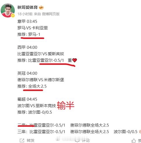 意甲 03:45罗马VS卡利亚里推荐: 罗马-1 西甲 04:00比雷亚雷