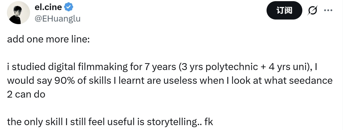 作为导演,el.cine坦言,Seedance 2.0是目前唯一让他产生强烈危机感的AI模型。