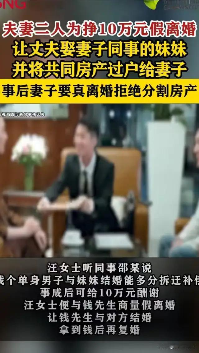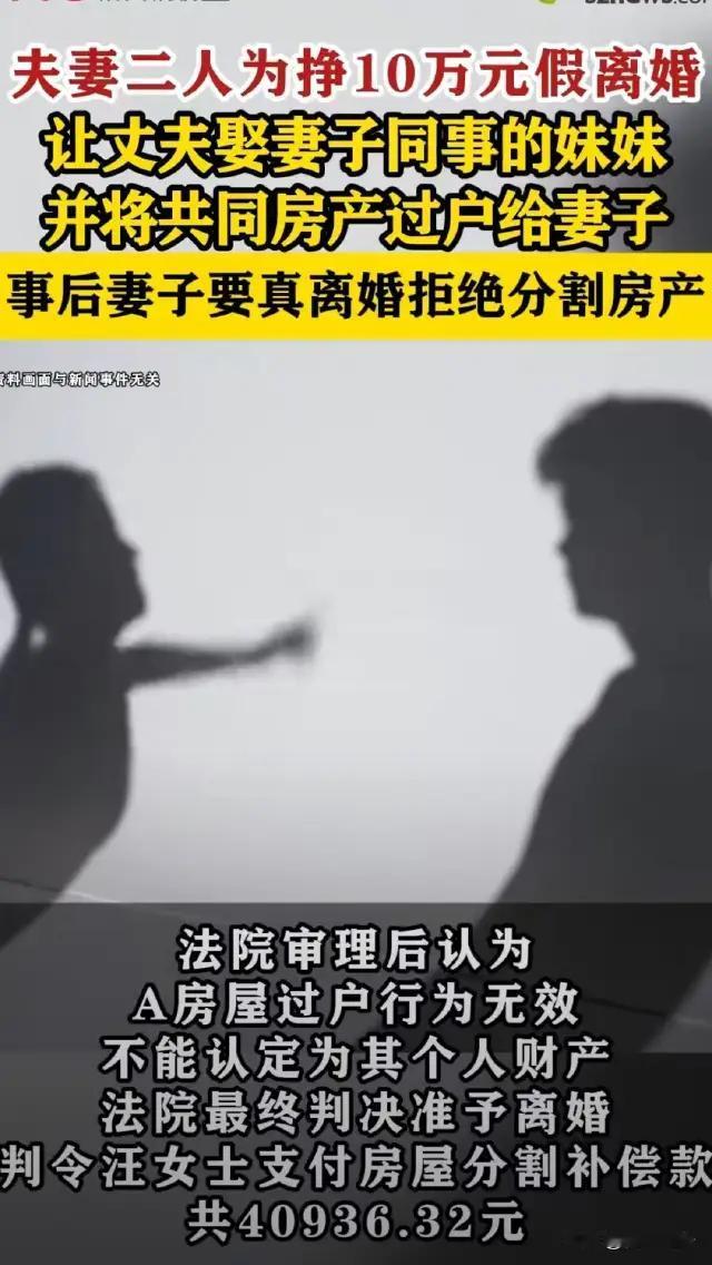 夫妻反目,弄巧成拙! 安徽的汪女士怎么也没想到,一次看似“稳赚不赔”的小算盘,竟成了婚姻破裂的导火索,还差点让她白得一套房、反失一场官司。 事情还得从2019年说起。那一年,汪女士和钱先生喜结连理,新婚燕尔,甜得像蜜糖。婚后一年半,钱先生为表深情,主动将自己婚前全款购置的一套房产变更登记为夫妻共有,明确写明汪女士占50%份额。这份沉甸甸的“爱意”,当时让汪女士感动不已。 可日子久了,激情褪去,生活归于平淡。到了2024年5月,办公室里的一席闲谈,却悄然撬动了这段本已平静的婚姻。 那天,同事邵某在茶水间低声透露:他妹妹名下有套房要拆迁,但因单身,按人头算补偿款吃亏。若能找个信得过的人“假结婚”,就能多拿一笔钱——事成之后,愿付10万元好处费。邵某强调,只是领证走个形式,签好协议,钱一到账就离婚,绝无后患。 汪女士心动了。10万块,不费吹灰之力,何乐不为?她回家跟丈夫钱先生一商量,钱先生也觉得是熟人介绍,风险不大,便点头应允。可汪女士心里却打起了鼓:邵某的妹妹年轻貌美,万一丈夫假戏真做,自己岂不是人财两空? 为打消妻子疑虑,钱先生拍胸脯保证:“我把那套婚前房全过户给你,这总行了吧?”于是,在2024年6月,钱先生真把那套原本已共有的房子,彻底过户到了汪女士一人名下。紧接着,两人提交了离婚申请——只为配合“假结婚”计划顺利推进。 然而,天不遂人愿。还没等他们走出30天离婚冷静期,邵某突然来电:“拆迁政策变了,项目暂停,这事先搁置。”计划泡汤,两人自然也没再办离婚手续,婚姻关系继续存续。可那套房子,却一直留在汪女士名下,再未转回。 风波虽平,裂痕已生。信任一旦动摇,感情便如沙塔般崩塌。2025年3月,汪女士向法院提起离婚诉讼,并主张:婚后共同购买的那套房依法平分;而那套婚前房,因已完成过户,已是她的个人财产,不应再分割。 钱先生同意离婚,也认可婚后房产平分,但对那套婚前房寸步不让。他坚称:当初过户并非真实赠与,而是为了配合“假结婚”骗取拆迁款所设的权宜之计,根本不是真心想把房子送出去。 法院经审理认为,关键在于两次产权变动的性质不同。第一次发生在2021年,钱先生自愿将婚前房登记为夫妻共有,各占50%,这是基于夫妻感情的真实赠与,合法有效,应予确认。而第二次在2024年的“全数过户”,其背景是为了实施以虚假婚姻获取额外拆迁利益的行为,该目的明显违背公序良俗,且非当事人真实意思表示。 根据《民法典》相关规定,民事法律行为若以合法形式掩盖非法目的,或违背公序良俗,应属无效。因此,2024年的那次过户行为被认定为无效。房屋产权状态应回归至2021年变更后的状态——即汪女士与钱先生各占50%。 最终,法院判决准予两人离婚。关于财产分割: 其一,钱先生婚前购买的房产,按各50%份额处理。因房屋现登记在汪女士名下,判归其所有,但须向钱先生支付相当于房屋市场价值50%的折价款; 其二,婚后共同购置的房产,双方一致同意平分,扣除剩余贷款后,由钱先生取得房屋所有权,并向汪女士支付相应折价款。 一场本想“空手套白狼”的算计,最终不仅没拿到那10万元,反而加速了婚姻的终结,还惹上官司。更讽刺的是,汪女士以为稳稳落袋的房产,竟因动机不纯而被法律“打回原形”。钱先生虽保住了部分权益,却也失去了婚姻与信任。 这起案件,恰似一面镜子——照见了人性中的侥幸与贪婪,也映出了法律对诚信与公序良俗的坚定守护。所谓“弄巧成拙”,莫过于此:机关算尽,反误了卿卿性命;一步踏错,满盘皆输。安徽婚姻闹剧 夫妻反目