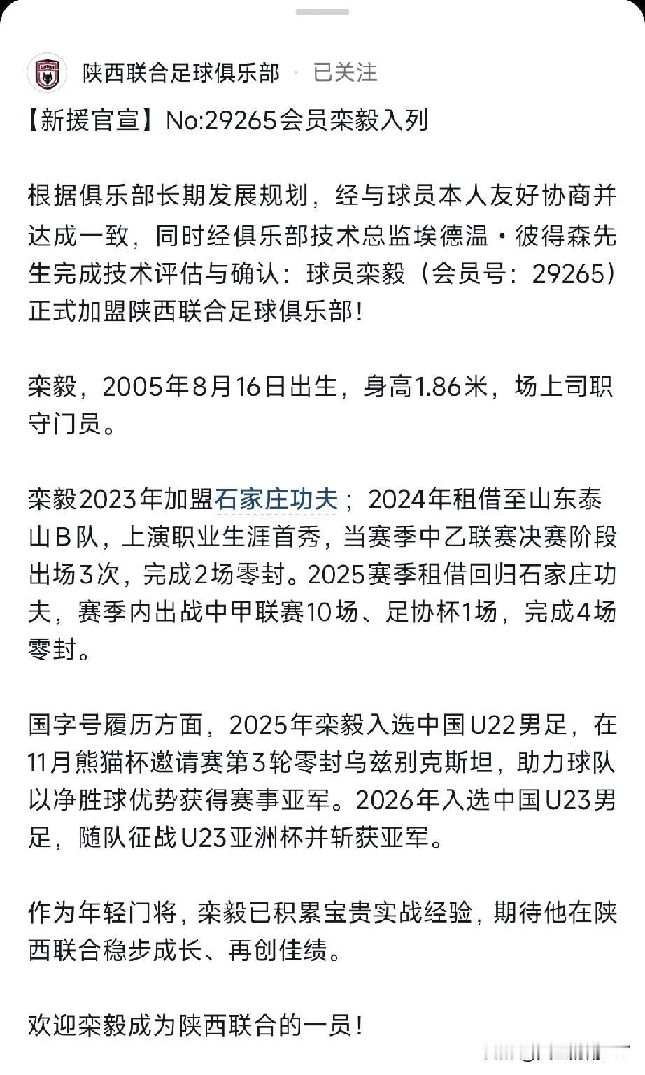 陕西联合这又官宣了一个门将,栾毅今年就引进了三个门将,看来今年对上赛季后防是猛补强啊!