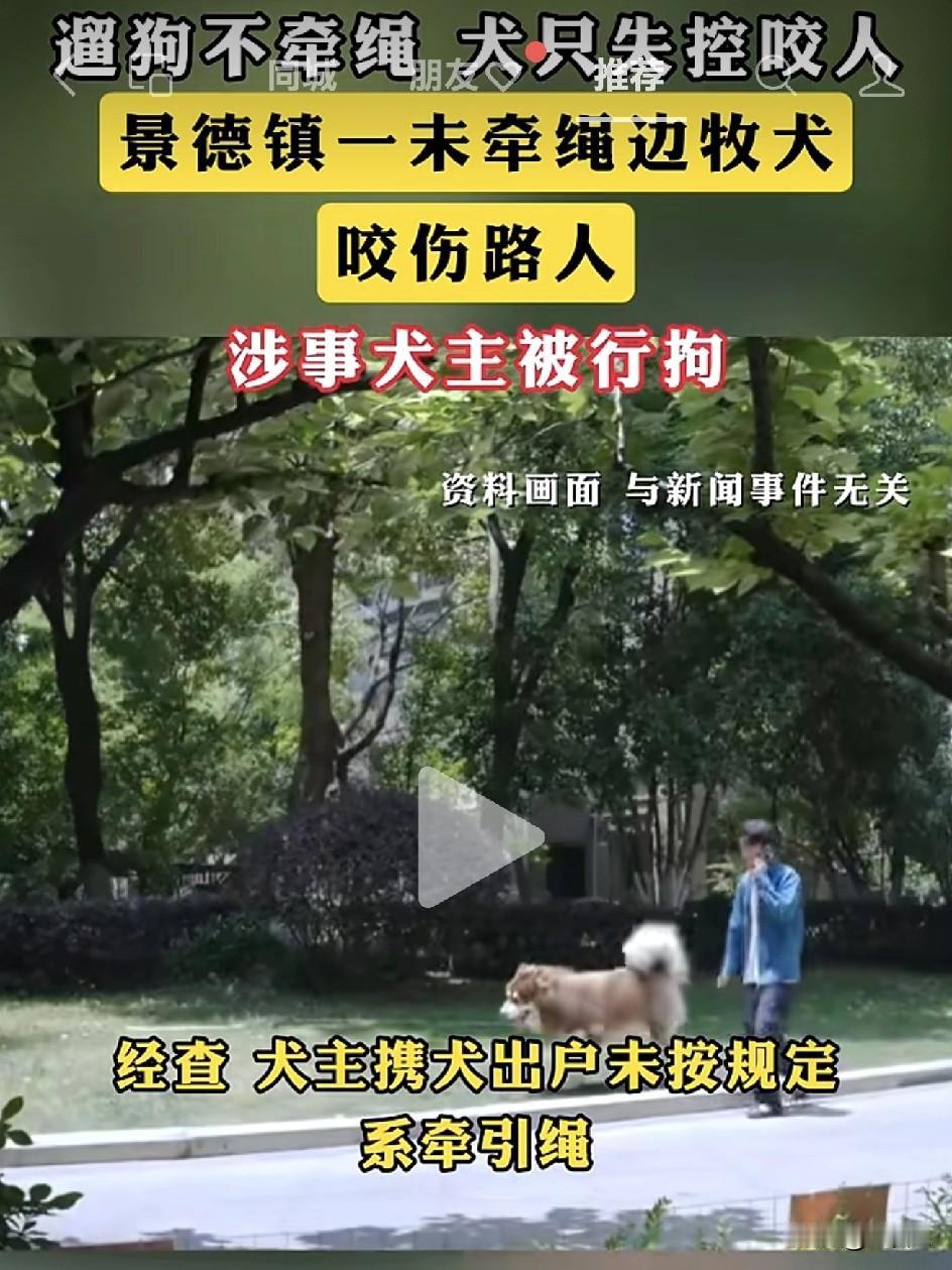 江西“狗主”摊上事了!遛狗不拴绳,直接拘留不叨叨!网友:新法开张,莫存侥幸! “哎呦喂,被狗咬了!” “啥?狗主还进去了?” 最近江西景德镇出的一档子事儿,让网友直呼:新规,动真格了! 就在上个月,浮梁镇美院星城附近,居民宋先生好端端走着路,突然就被一只“自由飞翔”的边境牧羊犬给“啃”了。 这狗哪来的?主人涂某某正潇洒地“空手遛狗”呢,绳子?不存在的。 民警火速赶到,一调查,事实清楚,证据确凿:狗主出门没给狗拴绳,狗子失控咬了人。这可不是简单的“赔个医药费”就能了事喽! 根据今年1月1日刚刚“上线”的新版《治安管理处罚法》,“未对动物采取安全措施致使他人受伤”,轻则罚款,重则拘留! 这回,涂某某就因为情节较重,喜提“行政拘留”套餐,外加赔偿伤者医药费。 真是“遛狗一时爽,拘留所里躺”。 警方敲黑板划重点了: 新法第八十九条写得明明白白,遛狗不牵绳,就是法定的“未对动物采取安全措施”!罚款是起步价,情节严重的,直接“五日以上十日以下”拘留伺候。 网友热评: “支持!让不拴绳的狗主也尝尝‘失去自由’的滋味。” “边牧智商那么高都失控,何况别的狗?绳子就是生命线!” “新法开张,典型案例,看谁还敢心存侥幸!” 温馨提示广大“铲屎官”们: 爱它,就请拴好它。手里的牵引绳,不仅是文明绳、安全绳,现在更是法律绳!别等进了拘留所,才想起“绳”的重要性。 遛狗牵绳,人狗平安,大家好才是真的好! 素材来源:澎湃新闻,侵联删!