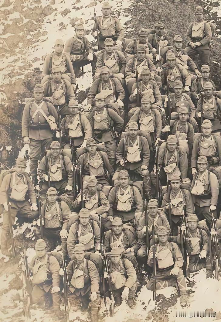 这群日本鬼子有的站在雪地里,有的蹲在雪地里,手里握着钢枪,全副武装,拍下了这张照片,不知道他们为什么要在这个荒郊野外的雪地上拍下这张照片,借这些日本鬼子的胸前都挂着一个包,看起来很特别,这和以往看到的照片是不太一样的,包里装的是什么?有人说是死去日本鬼子的骨灰,到底是什么说不清楚,但是看着挺怪异的,包括这张合影也是比较怪异的!
