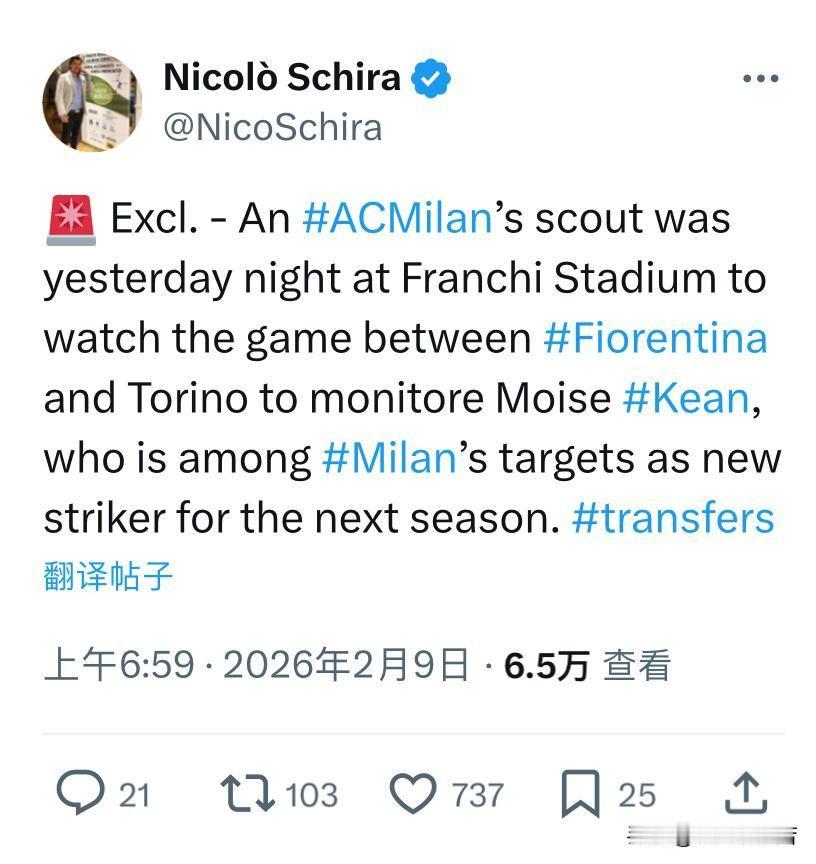 基恩!AC米兰的一名球探昨晚现身弗兰基球场,观看佛罗伦萨对阵都灵的比赛,考察莫伊