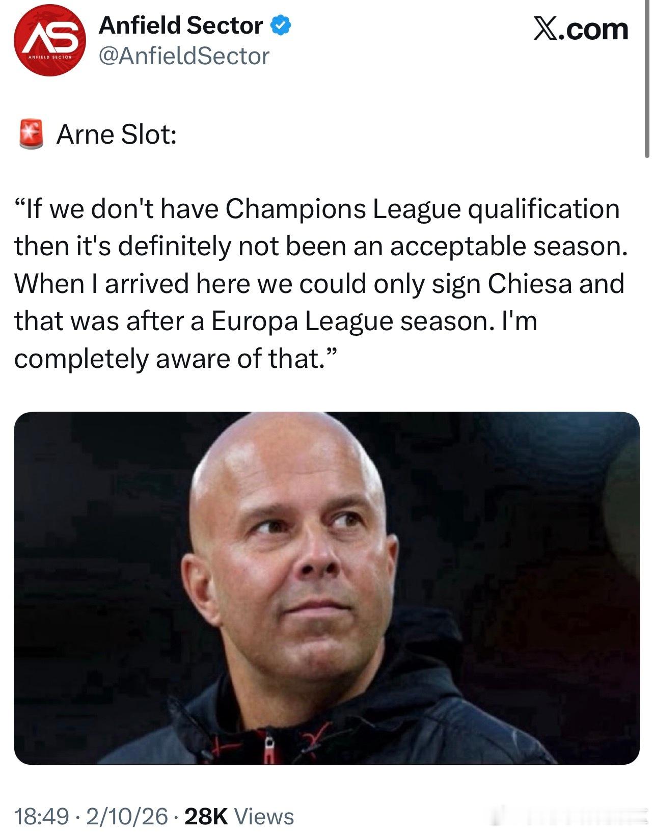 斯洛特看起来是完全崩了…谈下下赛季可能踢不了欧冠:如果我们下赛季没欧冠资格,那这赛季肯定是让人无法接受的。当我刚来这的第一个赛季,我们在欧联赛季之后只能签下基耶萨,我当然知道这意味着什么。谈拉姆塞:通常来说,如果你没赢球,那么没出场的球员就会成为最好的球员,这逻辑全世界在哪里都一样。这只是一个例子,我只是想保护我的球员,我到现在为止都一直在选择其他球员,我明天也会继续这么做。戈麦斯则是预计会在今天重返球队训练。