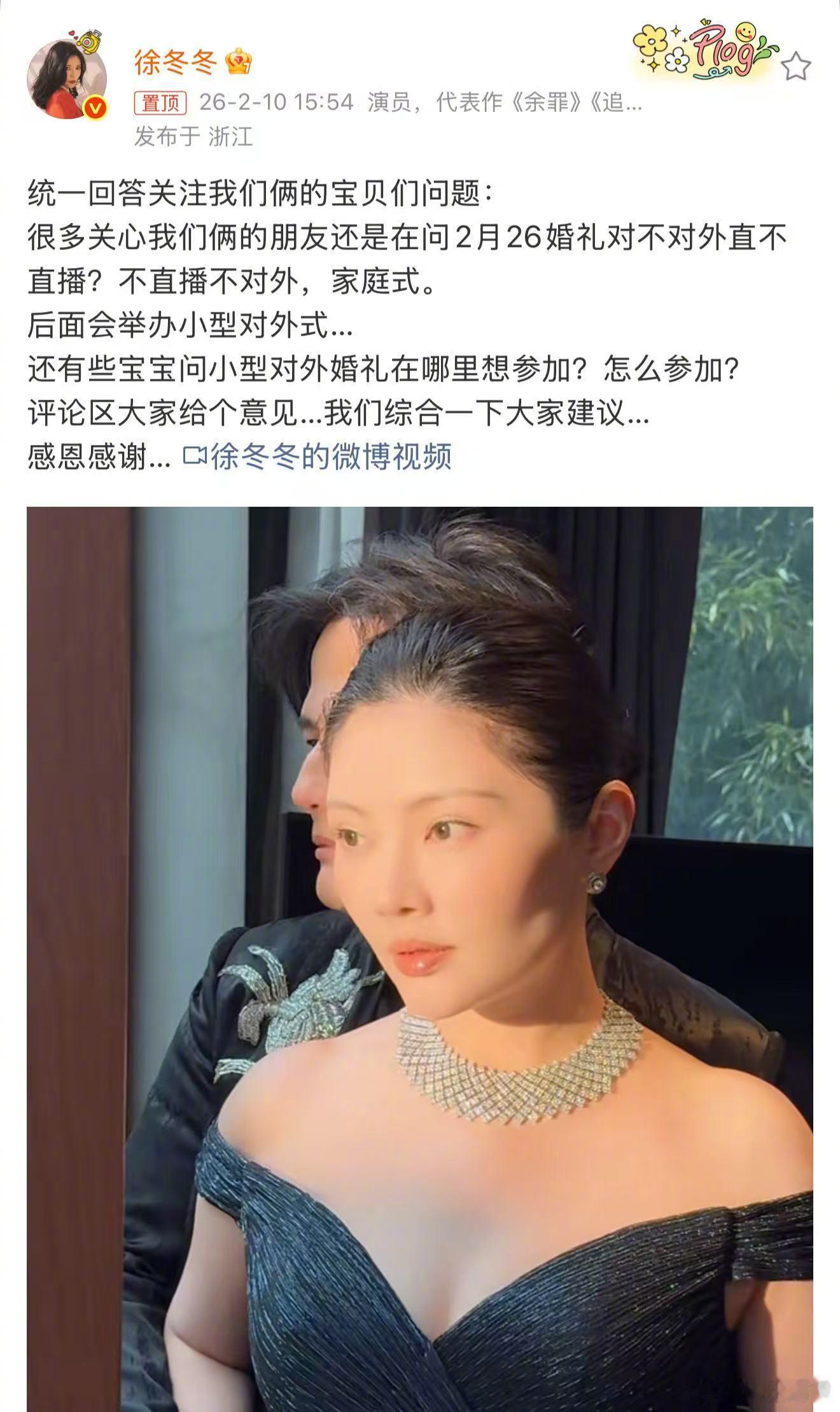 徐冬冬尹子维婚礼不对外直播 徐冬冬发博回应婚礼不对外直播:“不直播不对外,家庭式。后面会举办小型对外式” 。