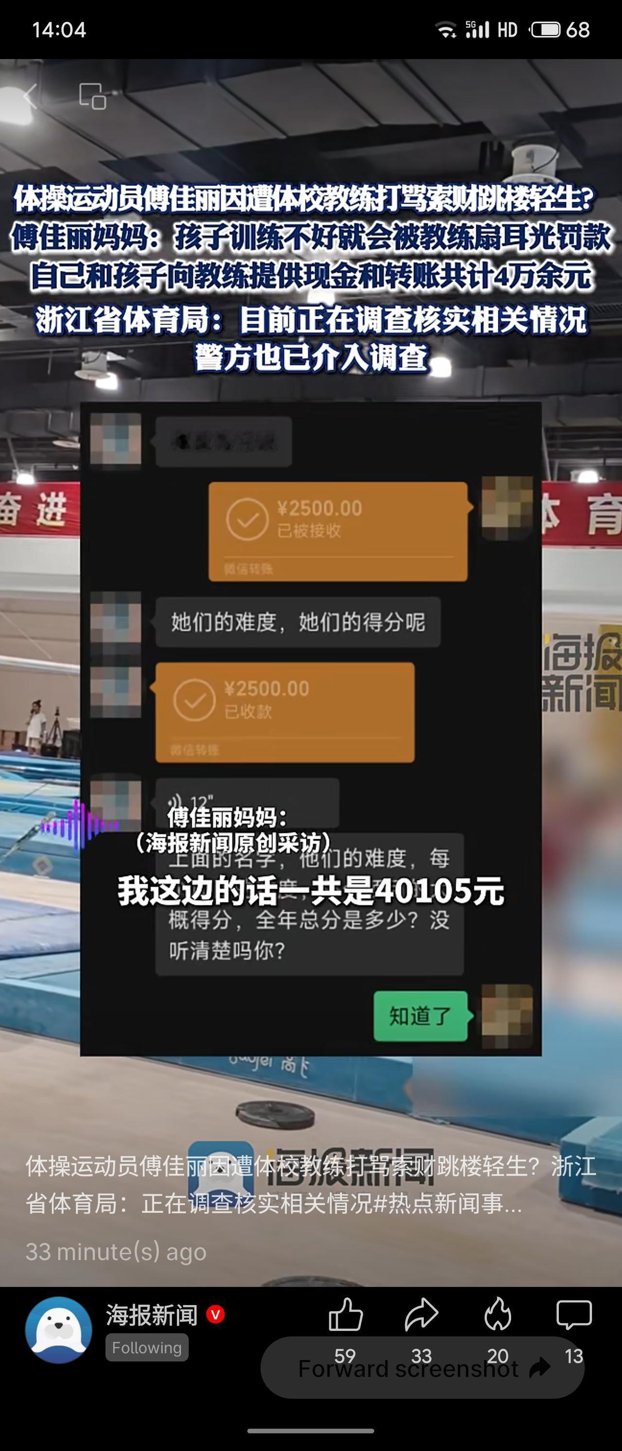 体操运动员傅佳丽被曝遭体校教练长期体罚(扇耳光)、索要钱财超4万元,疑因此试图轻生。目前浙江省体育局与警方已介入调查。此事反映出体育训练中存在的权力滥用、体罚与索财等严重问题,警示需加强对青少年运动员权益的保护与监管。