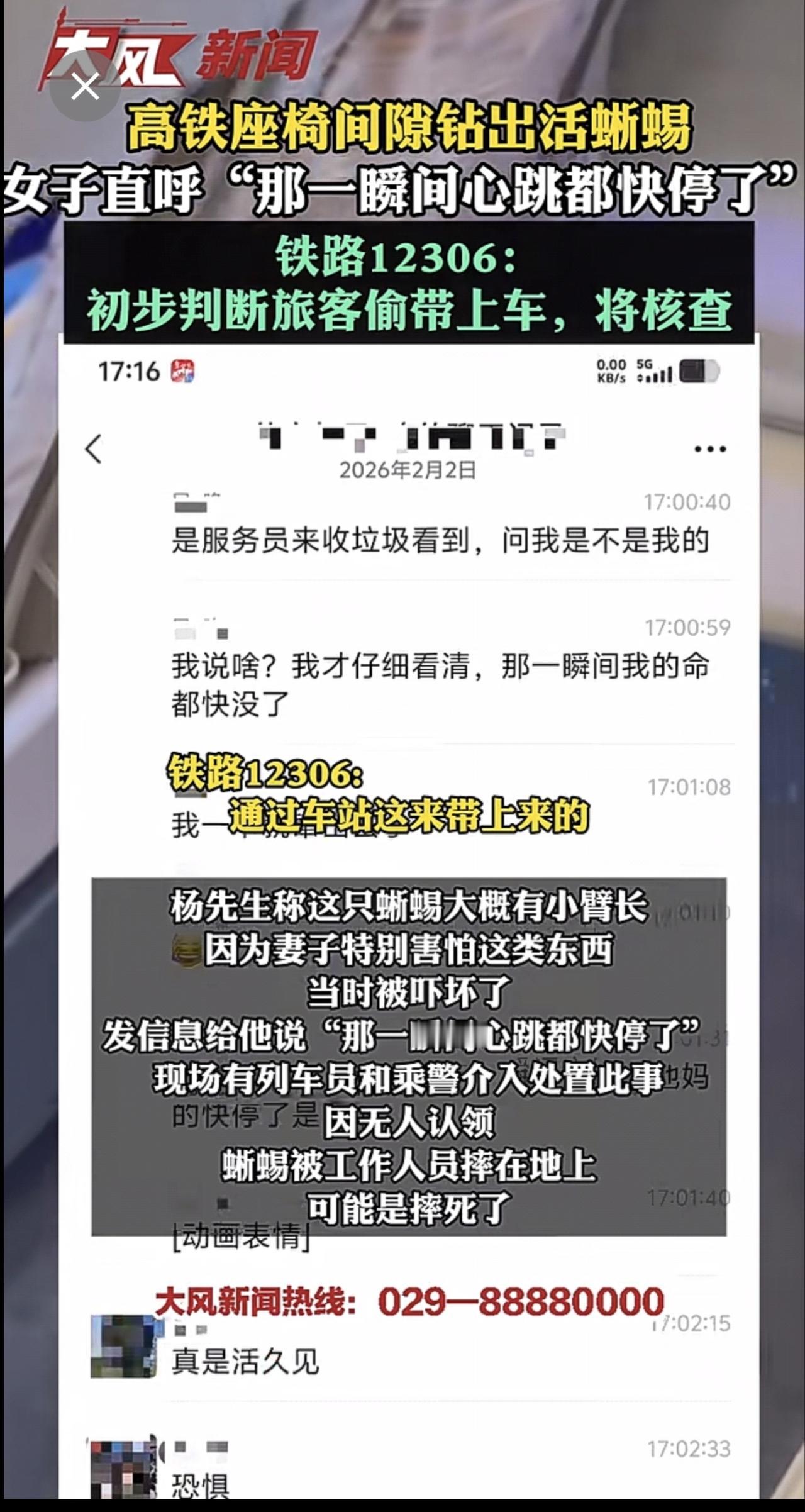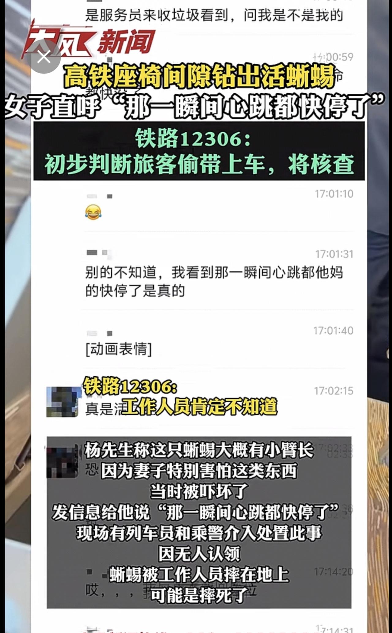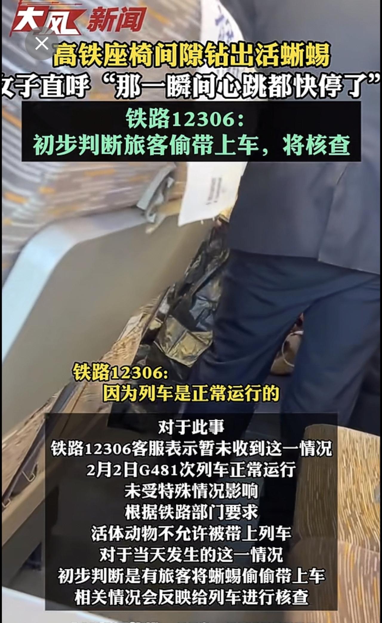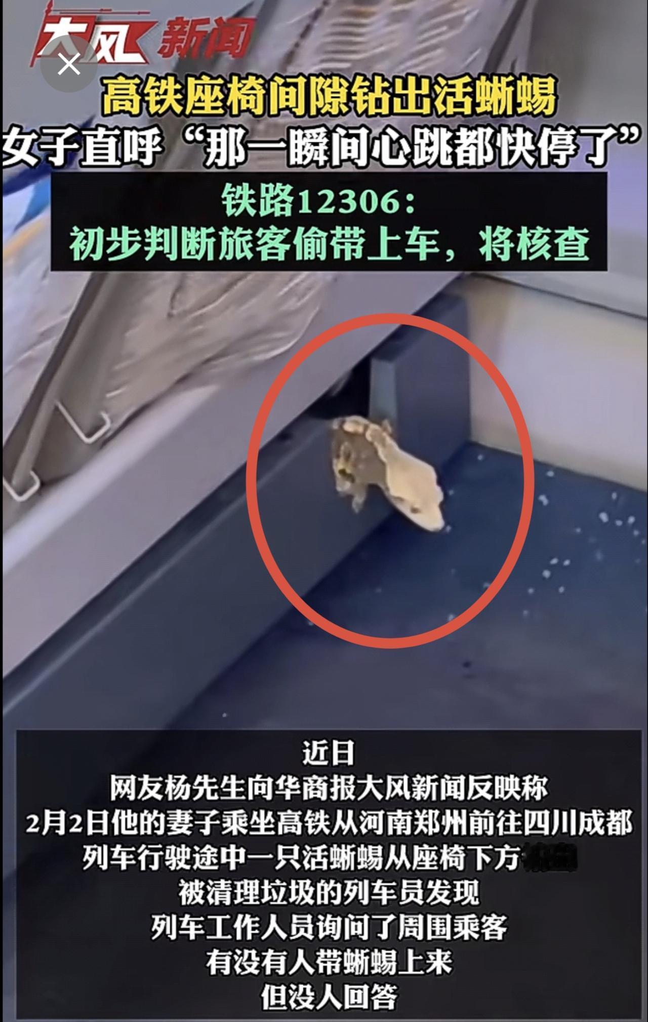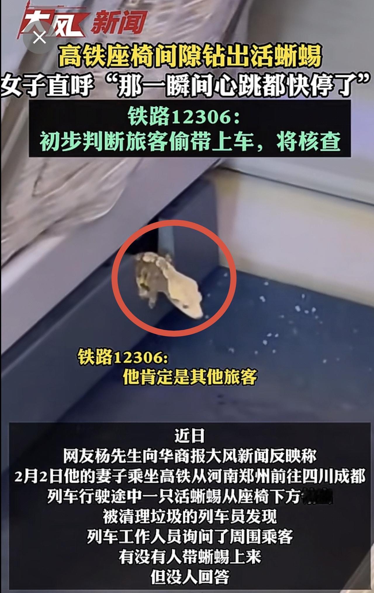 高铁座椅间隙钻出活蜥蜴,女子直呼“那一瞬间心跳都快停了” 12306:初步判断旅