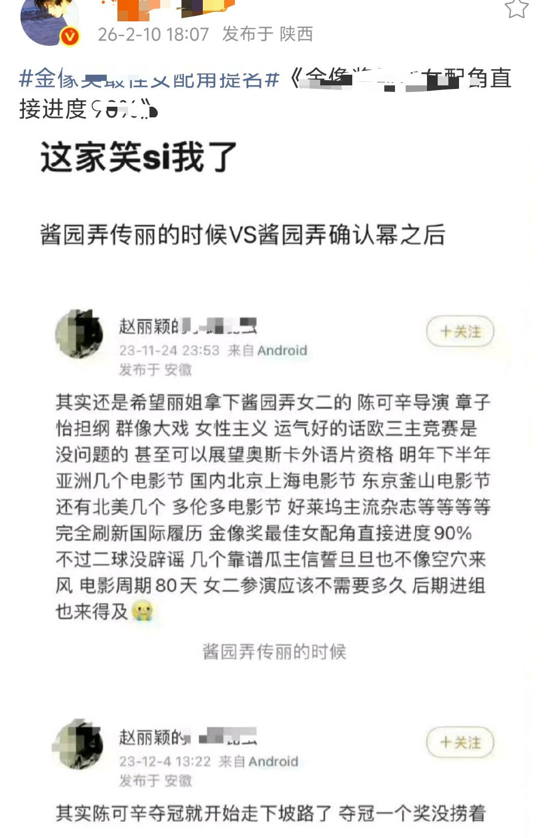 这两天都在等着看金像奖的热闹!最主要还是想看赵丽颖和杨幂的热闹,不少人觉得如果